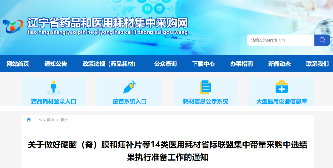 10月16日,辽宁省公共资源交易网发布消息,关于做好硬脑(脊)膜和疝补片等14类医用耗材省际联盟集中带量采购中选结果执行准备工作的通知,对执行前的准备工作做具体要求。