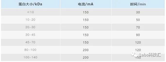小贴士:蛋白大小大于140kD条件下,先在电流200mA情况下转膜120min,然后将电流提高到250mA,继续转膜30min。