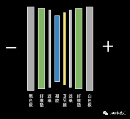 3. 按照黑色板-纤维垫-滤纸-凝胶-PVDF膜-滤纸-纤维垫-白色板依次放好,夹紧板后放入湿转电转槽内,黑色板的一面对黑色负极;