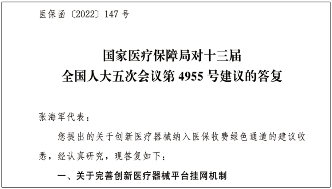 “为规范DRG工作,国家医保局制定发布了《国家医疗保障疾病诊断相关分组(CHS-DRG)分组与付费技术规范》。针对已在医保经办备案的新技术项目,技术规范明确可暂先按项目付费执行一年后,再根据数据进行测算,修订该病种分组的支付标准。针对疑难重症,技术规范明确可提高疑难重症DRG组的权重值,降低轻症DRG组的权重值。” 同样,在去年9月3日,国家医保局在《对十三届全国人大五次会议第4955号建议的答复》中,也专门针对创新医疗器械给出解释,在带量采购中也为创新器械留出空间。