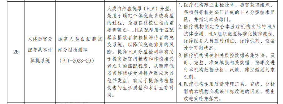 (1)感染科:提高呼吸道病原体核酸检测覆盖率和呼吸道感染性疾病核酸检测百分比! 呼吸道传染病是全球重大公共卫生问题,早期从发热和(或)呼吸道症状患者中正确识别并明确病原学诊断是呼吸道传染病防控的关键环节。医疗机构应当开展呼吸道病原体检测技术,医务人员应当熟练掌握呼吸道传染病的临床特点、标本采集和病原学检测技术。 室间质量评价是临床实验室保证和改进检验质量的重要手段,是公立医院绩效考核中的重要指标。国家卫生健康委临床检验中心及各省级临床检验中心组织的室间质量评价活动对保证检验结果的可比性和同质性,推进临床检验结果互认,提高我国临床检验质量有重要意义。(3)人体器官分配与共享计算机系统:提高人类白细胞抗原分型检测率 (PIT-2023-29) 人类白细胞抗原(HLA)分型,是用于确定个体免疫系统类型的过程,是器官移植过程的重要步骤之一。HLA 配型用于匹配器官捐献者和移植等待者的免疫系统,以降低免疫排异的风险。提高 HLA 分型检测率有助于提高器官捐献者和移植接受者之间的匹配程度,从而降低器官移植接受者排斥反应及其他并发症,有助于提高移植接受者的生活质量和术后生存时间。(4)医院感染控制专业:提高住院患者抗菌药物治疗前病原学送检率 (PIT-2023-37) 当前,全球普遍关注抗菌药物临床使用问题。提高抗菌药物治疗前病原学送检率,尤其是发生医院感染者和应用限制使用级以上抗菌药物的患者,提高抗菌药物治疗前规范送检意识和规范无菌性样本送检,可以有效提高抗菌药物使用的科学性和规范性,对遏制细菌耐药、提升治疗效果和保障人民群众健康权益具有重要意义。