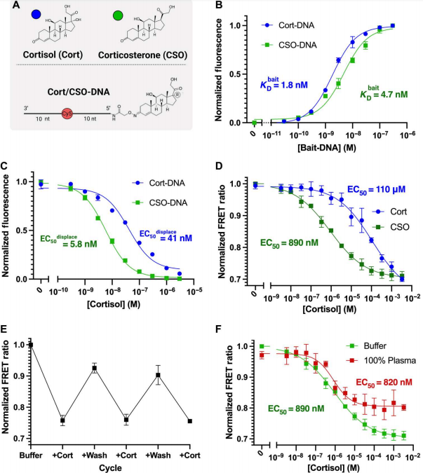 作者选择了一种皮质醇的单克隆抗体,然后筛选诱饵分子(下图A)。含有皮质醇的诱饵-DNA (Cort-DNA)表现出较低的KDbait 1.8 nM(下图B),并与游离皮质醇激烈竞争,在10 nM诱饵-DNA存在下,需要41 nM皮质醇才能实现50%的结合位移(下图C)。相比之下,皮质酮诱饵-DNA (CSO-DNA)表现出更高的KDbait 4.7 nM ,需要5.8 nM的游离皮质醇就能达到10 nM的CSO-DNA的等效位移。
