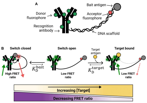 在抗体开关设计中,IgG抗体被设计成一个分子开关,抗体与含有分子“诱饵”的DNA支架特异性连接,靶抗原和分子“诱饵”之间可发生竞争性结合(下图A)。当游离抗原取代结合的诱饵时,导至系统发生构象变化。通过基于FRET的荧光可知晓开关的构象变化,从而达到连续测量目标浓度的变化的目的(下图B)。在没有靶标的情况下,连接的诱饵分子通过分子内相互作用与抗体结合(KDbait);当靶标存在时,分子内反应和抗体-靶标结合(KDtarget)之间的竞争导至结构从封闭状态(高FRET比率)切换到靶标结合状态(低FRET比率)。诱饵和靶标在结合后都能与抗体分离,从而实现可逆的开关和信号传导。