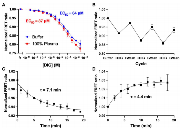 快速和可逆地传感目标浓度变化的能力对于连续传感器也至关重要。作者在3小时的实验过程中将抗体开关反复暴露于高浓度的DIG (1 mM)缓冲液与无靶缓冲液中。结果显示可逆和可重复的FRET转换,包括三个靶标添加和洗脱周期(下图B)。