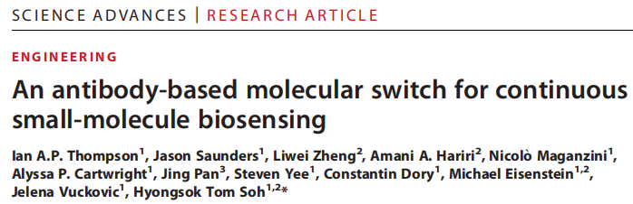此设计提供了一种将抗体转化为传感器结构的通用策略,仅需要最少的筛选工作,并且无需对抗体蛋白本身进行任何工程设计。因此,作者相信这种抗体开关方法有可能加速各种连续生物传感器的发展,用于生理监测和改善患者护理。