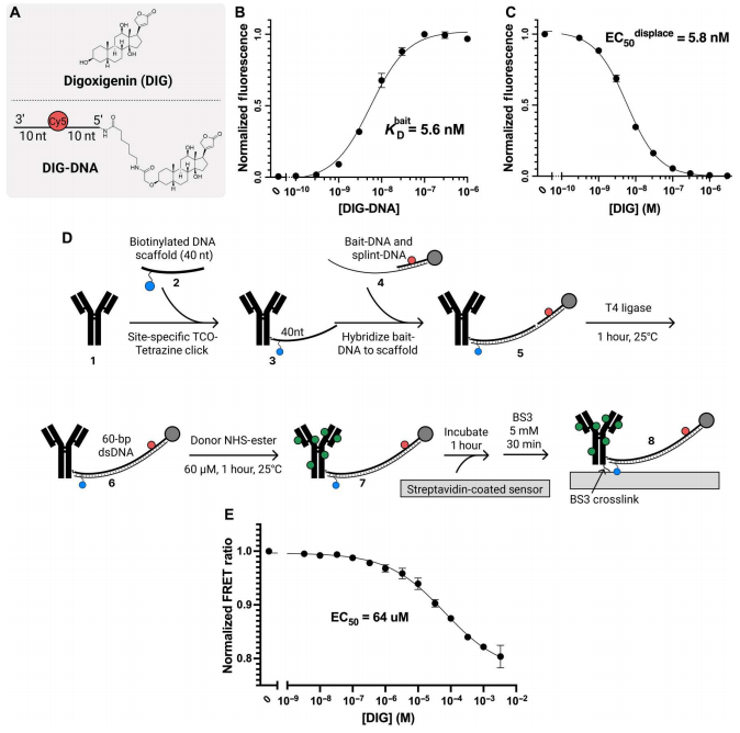 作者发现DIG多克隆抗体(pAb)在构建抗体开关方面表现出优异的性能,与DIG-DNA结合KDbait为5.6 nM,表明DNA的附着没有明显破坏DIG抗体结合界面(下图B)。游离DIG略优于DIG- DNA;对于10 nM的DIG-DNA,5.8 nM的DIG可取代一半的结合DIG-DNA(下图C)。作者随后合成了完整的抗体开关结构(下图D)。正如预期的那样,随着DIG浓度的增加,FRET比率下降(下图E)。将FRET响应拟合到Hill结合模型可知传感器的Hill系数(n)为0.51,EC50为64 μM。该开关对DIG浓度变化的响应跨越超过10,000倍的动态范围,检测限(LOD)为68 nM。