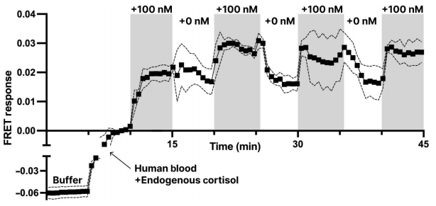 作为概念的最后证明,作者测试了抗体开关生物传感器在99%的人类全血中直接检测生理皮质醇的性能,而无需制备样品。在45分钟范围内,作者测量了三个独立制造的传感器对健康人类供体血液中皮质醇增加和减少的重复周期的响应(如下图)。结果显示,传感器捕获了这100 nM皮质醇的增加和减少,并且对每次浓度变化的响应在5分钟内完成。虽然存在传感器响应不一致以及信号退化等问题,在未稀释的全人血液中连续检测生理皮质醇峰值的能力是一个重要的进步,为未来在未稀释的生物体液中开发更强大的性能奠定了基础。