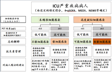 用于呼吸道感染的ABS临床试验的PCT推断 PCT-指导ABS的概念,首先在低呼吸道感染的ED病人进行检测[19]。考虑了在病毒感染的PCT依然很低(未检出)、而在细菌感染中升高,若PCT水平各自为<0.1 μg/L或<0.25 μg/L,研究推断建议,非常强烈或强烈地反对使用抗生素。推断也包括了一些否决的指标,所以,处于非常高风险的病人依然按照经验治疗,除非很低的PCT水平。按此,给出了两个水平的建议,也为PCT高于<0.25 μg/L的病人,开始抗生素治疗建议,以及PCT高于<0.5 μg/L(抗生素强烈地建议)。研究展现了在抗生素使用率上显著的减少,特别对气管炎和COPD加剧的病人。 以后不仅研究了PCT对开始凭经验的抗生素治疗,而且也使用PCT去监视治疗的响应,并在各个病人基础上决定中止抗生素治疗[19,20]。PCT下降低于0.25 μg/L、或从峰值下降至少>80%-90%,被用作停止使用抗生素的规则临界值。这个方式进一步减少了抗生素使用,通过缩短治疗的期限,特别是对CAP病人。以后的一个大型的遍及瑞士的、随机化的、非自卑试验(non-inferiority),发现这个方式在减少抗生素使用超过3天上高度有效,没有增加不利后果的风险[16,21]。 今天,多个类似的试验在不同国家和不同临床情况下实施(即,从初级治疗到急诊部和住院病房,到重诊监视病房)。最近的荟萃分析包括来自12个不同国家的26项随机对照试验的6708名不同类型和严重程度的呼吸道感染病人的各个病人数据,调查了PCT指导的抗生素决策[22,23]在呼吸道感染情况下的效果(与总体情况相比) 数据荟萃分析,病人级别的数据荟萃分析允许按感染类型和临床环境对结果定义和亚组分析进行标准化。该研究表明,在呼吸道感染中使用PCT可以减少抗生素的暴露(抗生素的起始剂量从86%降低到72%,总暴露量从8.1天减少到5.7天),抗生素的副作用(从22.1%降低到16.3%),死亡率显着降低14%(从10%降至8.6%)。结果在不同的临床情况(即初级治疗、ED、或critical care急救护理)、以及感染类型(肺炎、气管炎、COPD加剧)等是一致的。 在临床试验中使用的PCT判断限的第二次分析,揭示了用于开始使用抗生素的主要判断限,适用于病人的严重性。因此,在初级治疗或ED中处于轻微或中度疾病病人,使用了PCT判断限0.25 μg/L,而严重疾病的病人(即,要求入住ICU病房)主要使用判断限为0.5 μg/L[24]。同样,对轻微/中度或严重疾病的,为中止抗生素使用的PCT各自为0.25 μg/L或0.5 μg/L,或PCT显示了从峰值下降≥80%[8]。 *警示内容:对具有免疫抑制(包括HIV)、CF(囊性肺纤维化(cystic pulmonary fibrosis))、胰腺炎、烧伤、大容量输血、疟疾等;以PCT指导的管理不应用于慢性感染(如,脓肿、骨髓炎、心内膜炎)。 图1:非ICU中轻微疾病病人PCT的使用 *警示内容:对具有免疫抑制(包括HIV)、CF(囊性肺纤维化(cystic pulmonary fibrosis))、胰腺炎、烧伤、大容量输血、疟疾等;以PCT指导的管理不应用于慢性感染(如,脓肿、骨髓炎、心内膜炎)。 图2:非ICU中中度疾病病人PCT的使用 *警示内容:对具有免疫抑制(包括HIV)、CF(囊性肺纤维化(cystic pulmonary fibrosis))、胰腺炎、烧伤、大容量输血、疟疾等;以PCT指导的管理不应用于慢性感染(如,脓肿、骨髓炎、心内膜炎)。 图3:对ICU中严重疾病病人PCT的使用 脓毒症中PCT指导ABS的临床试验和推断 使用PCT对个性化抗生素治疗提及的概念,也吸引了ICU脓毒症病人。但是,开始关注的是对最严重病人这个方式的安全,由于太短时间使用抗生素,可能会造成感染复发和较高的死亡率。第一个概念验证研究是对ICU中脓毒症的病人[14],发现减少抗生素暴露,没有以往对后果的负面影响。该试验对脓毒症病人使用了较高PCT判断限(0.5-1 μg/L),也使用了PCT的动态观察(从峰值水平减少到>90%),建议中止抗生素。这个概念以后在多中心、非自卑(non-inferiority)PRORATA试验中[17],PCT在脓毒症病人中使用是充分和安全的。因为ICU的脓毒症病人具有一个先天高风险,治疗时间是决定性的。使用PCT主要为早期中止治疗,但不是为指导经验治疗[25]。这个概念以后也在降钙素原指导中止抗生素(SAPS)研究中检测确认,该研究中的所有具有疑似脓毒症病人开始了抗生素治疗,在PCT水平至少从峰值减少了80%、或PCT将到低于0.5μg/L下中止抗生素。与标准治疗比较,使用PCT可减少抗生素的暴露(抗生素持续从7天到5天),并改善了存活(在1年里6.1%较好的存活)[7]。 一个近期对11个在危急脓毒症疾病病人中以PCT指导ABS的临床试验,进行的病人-水平荟萃分析[26],也发现在2252例PCT-指导病人,较2230例对照组病人的死亡率显著地较低(21.1%yu 23.7%)。这个发现与按照感染类型(呼吸道、尿道、腹部、皮肤或中枢神经系统)、脓毒症-3定义或脓毒症的严重性(由相继器官衰竭评估确定[SOFA]得分、存在脓毒症休克或肾衰、或需要加压或供氧支持)分类的亚组分析一致。研究也揭示了,在脓毒症病人中,PCT使用导至较早中止抗生素、并减少治疗持续从10.4天到9.3天,看来对较少严重脓毒症病人和呼吸道感染病人有较强烈的作用。进一步的荟萃分析也揭示了,存活的好处与仅为抗生素中止的PCT推断有关,而对ICU病人,PCT推断对抗生素开始或混合方式,没有减少死亡率[27]。最后,集中关注具有培养阳性的细菌感染病人的荟萃分析,也发现了对抗生素用法上PCT使用的显著作用,没有不利的临床后果的证据,除了缩短了抗生素的持续使用[28]。
