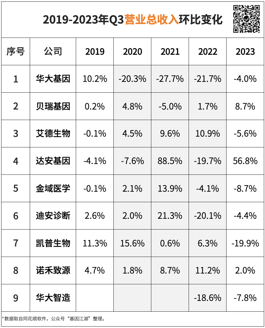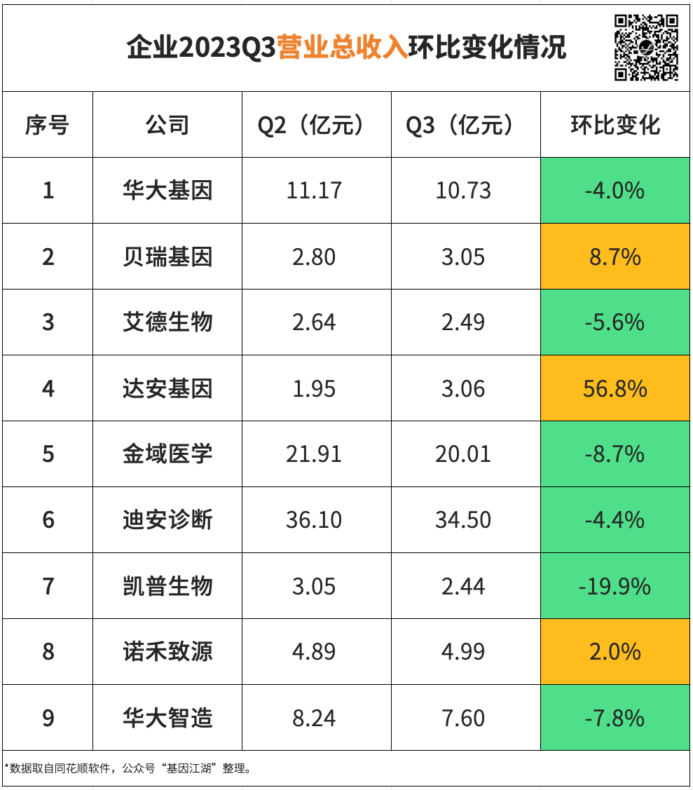 医疗反腐在7月中发酵,8-9月达到高潮,正好覆盖整个Q3。在8月中旬,基因江湖发起的一次500人行业调查中:调研结果显示,57%的受访者表示对所在公司/个人的业绩影响超20%;部分公司业绩甚至暴跌50%。10月最后一天,随着各大公司陆续公布2023年第三季度报,由此可以尝试解答一个疑问:医疗反腐对各公司业务的实际影响,是否会在Q3季报中体现?为解答这个问题,整理了市面上有代表性的9家企业Q3财报信息,依次为: