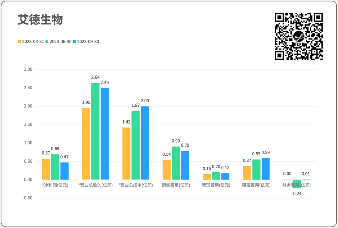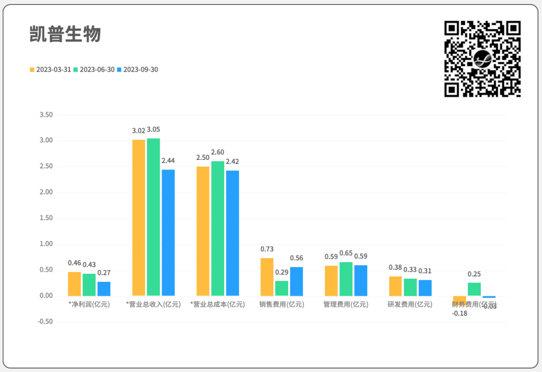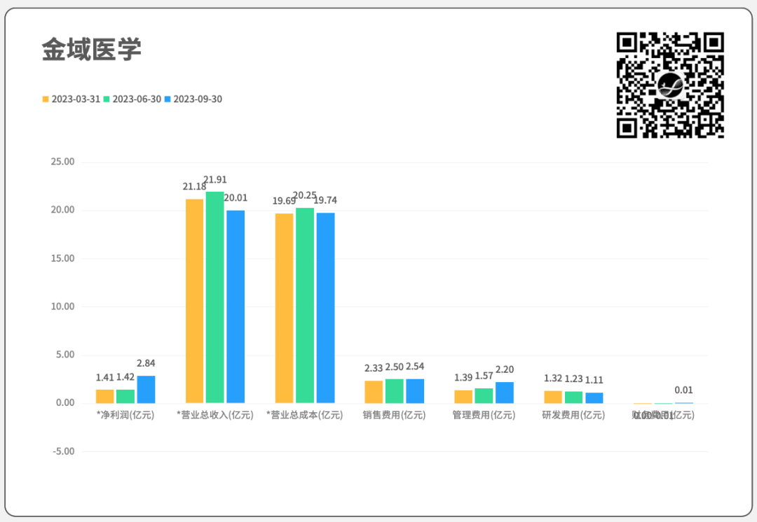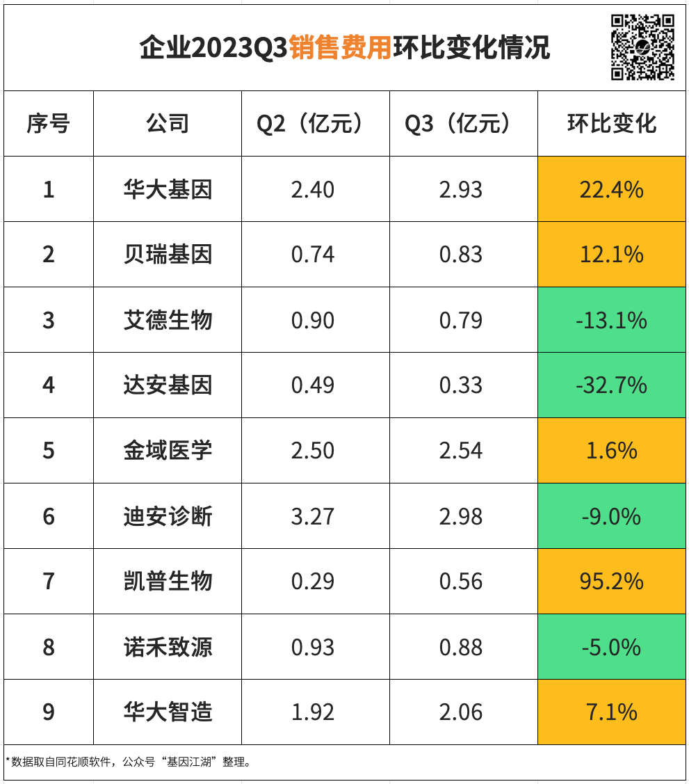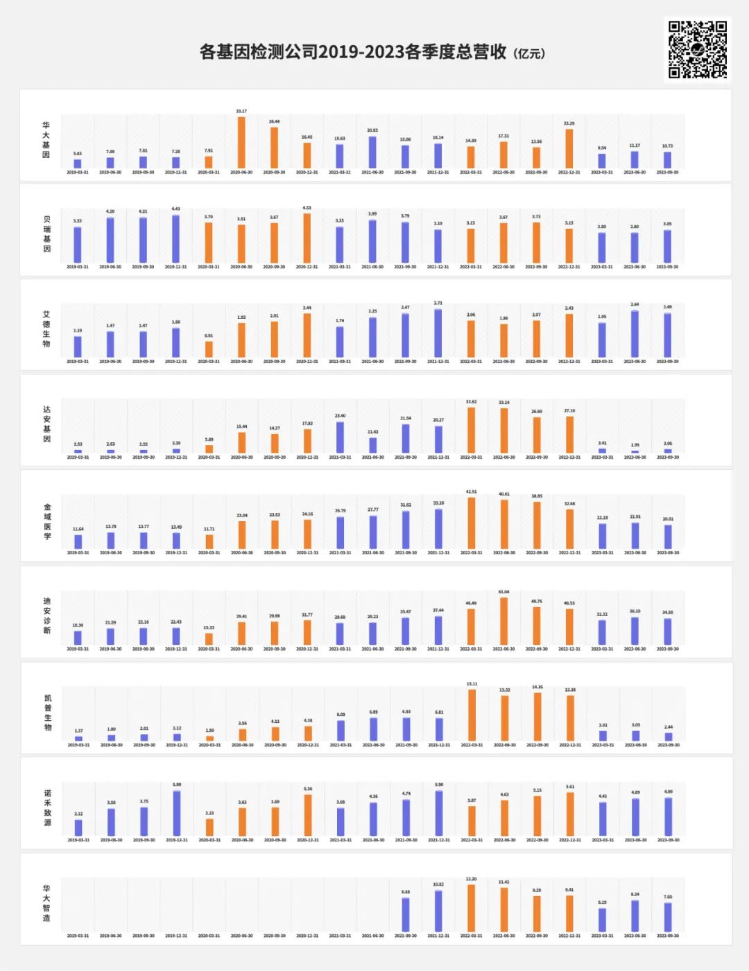 01 各企业相关财务数据,取自“同花顺”软件,与企业披露的财报数据可能略有出入,但不影响趋势。不同于各企业在财报中的“同比”计算方式,我们采用“环比”,即本年度Q3和Q2比较。选择“环比”的原因有两个: 原因1. “同比”计算中,比较对象是去年同期,而去年2022年尚在疫情阶段,常规业务数据失真,“同比”数据会失衡; 原因2. 本年度Q2、Q3同处疫情放开管控阶段,可以“环比”;医疗反腐措施集中在Q3发生,对Q2影响较小,通过“环比Q2”可以更直观看到医疗反腐对业绩的影响。假设1:如医疗反腐对业绩有重大冲击,营业总收入会大幅下降;假设2:在医疗反腐各种管控措施下,销售费用会大幅下降;所以,需识别“业绩的变化,是业务的自然波动,还是医疗反腐的影响”。9家企业,3家Q3业绩增长,6家Q3业绩下跌,除凯普生物以外,其余企业跌幅均在10%以内,未见大幅下跌情况。9家企业,5家Q3销售费用增长,环比增幅最高为凯普生物95.2%;4家Q3销售费用下跌,跌幅最高为达安基因32.7%。未见“提前假设”中,由于医疗反腐措施导至的销售费用普遍下跌现象。销售费用涨22.4%,总营收降4%;净利大涨72.2%(基数较小)。 销售费用涨12.1%,总营收涨8.7%,亏损缩窄46.6%。 销售费用降13.1%,总营收降5.6%,净利降32.4%。销售费用降32.7%,总营收涨56.8%,净利降114.5%。销售费用微涨1.6%,总营收降8.7%,净利增100.8%。销售费用降9%,总营收降4.4%,净利降49.5%。销售费用涨95.2%,总营收降19.9%,净利降36.5%。销售费用增7.1%,总营收降7.8%,净利降286.5%。为识别季度业绩变化是自然规律性波动,还是医疗反腐所致,拉长时间线,看看企业2019-2023年各季度表现,以“总营收”科目计。如图所示,除诺禾致源外(Q1→Q4呈递增趋势),其他公司在历年各季度业绩中,并未表现出明显的规律性波动。如表所示,开展新冠业务的企业,在疫情期间业绩波动较大; 参考未受疫情影响的2019年,各企业Q3业绩波动在10%以内或附近;2023年,除达安基因、凯普生物以外,余下企业Q3业绩波动也均在10%以内,较2019年并未表现出明显的差异。医疗反腐对各企业的冲击有限,并未出现业绩大幅下跌的情况。04 局限性讨论 本篇只是各上市企业Q3业绩概览,重点观察医疗反腐的直接影响。有以下局限:(1)从各省市管控措施和市场反馈看,医疗反腐对如走廊收费的不合规业务、外检业务等影响较大,而对已入院项目影响较小。本篇未考虑不合规业务、外检业务等占企业总体业务比例情况。(如诺禾致源主要营收来自科研服务,临检业务占比较少。)(2)未考虑财报收入确认滞后带来的影响,持续关注Q4业绩。关于推演路径是否合理,是否与各位在市场中的体感相近。欢迎留言讨论。