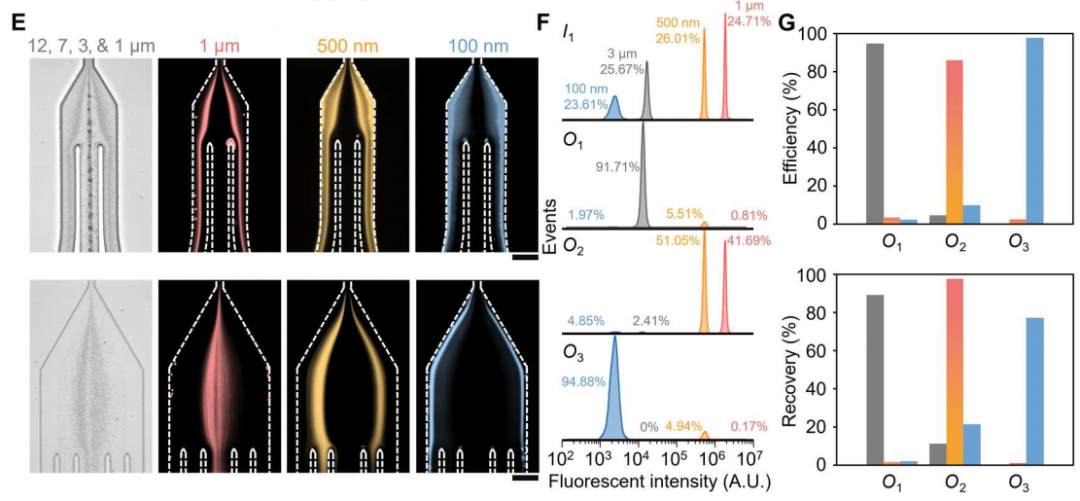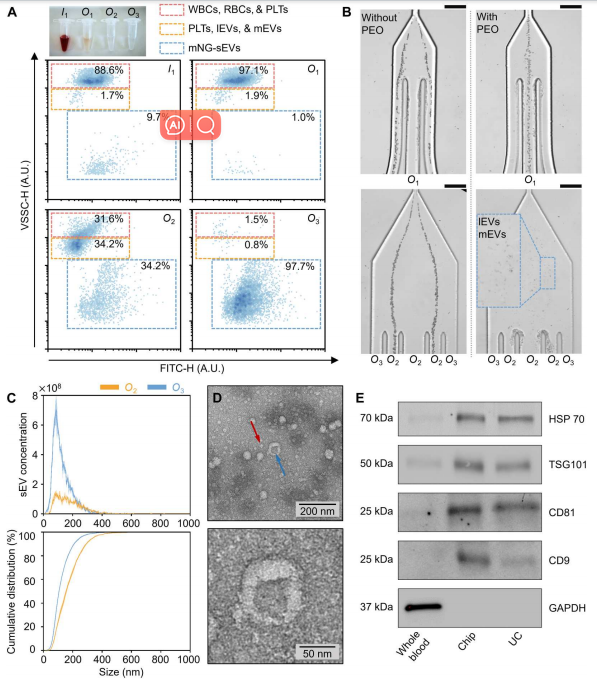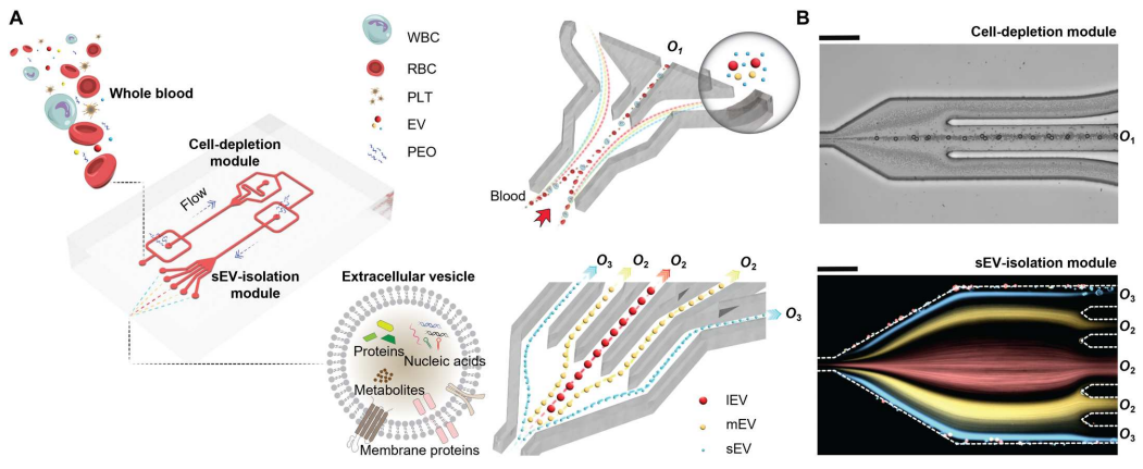介绍 小细胞外囊泡(sEVs;< 200nm),含有脂质、核酸和蛋白质,sEV存在于所有体液中,因此是无创诊断和预后生物标志物的极好来源,包括癌症、感染、神经退行性病变。基于超速离心(UC)、梯度离心等传统sEV分离方法存在一系列局限性,包括处理时间长、收率低(5%至40%)、分离sEV完整性低和设备成本高。尽管许多新sEV分离方法已经减轻了上述一些问题,但它们远非理想,会引入其他问题比如纯度低及样本损失等。 在过去的十年中,微流体技术已经越来越多地被用作sEV处理和分离的基本工具,根据分离模式的不同,微流体分离sEV的策略可以分为被动和主动两类。被动分离方法不需要施加外力,而是通过使用大小相关的水动力或复杂的通道结构来分离sEV。相反,主动分离方法需要应用外力场,尤其是声场、电场和磁场来操纵sEV。主动方法已成功地用于分离血源性sEV,其特点是分离效率高,但设备制造和操作复杂,这限制了在临床环境中的使用。被动微流体系统也已成功地用于从全血中分离sEV,但受到了分离效率和回收率低、通量低的限制。在临床环境中,迫切需要制造成本低廉,操作简单,不需要专业知识,涉及最少的样品制备,并产生一致和可重复的结果,同时提供高分离纯度和回收率的EV分离系统。 近日,一组来自瑞士的研究团队在杂志Science advances上发表了一篇题为“Direct isolation of small extracellular vesicles from human blood using viscoelastic microfluidics”的文章。文章中,作者提出了一种被动、高效、粘弹性和无标签的微流体装置,能够直接从人体血液中分离sEV。集成系统包括两个模块:细胞去除模块和sEV分离模块。为了证明该系统在临床液体活检中的有效性,作者从20名癌症患者(CP)和20名健康献血者(HD)的血液中分离出sEV,并将其浓度和大小与通过金标准UC获得的数据进行比较。与现有的sEV分离技术相比,此粘弹性微流控平台具有低成本、易于操作、高sEV回收率和高纯度的特点,可用于科研和临床研究。 图片来源:Science advances 主要内容 粘弹性sEV分离的芯片设计及工作原理 下图展示了微流控装置的结构和sEV从全血分离的潜在机制。简而言之,该装置由两个按顺序排列的模块组成:细胞去除模块和sEV分离模块。工作原理是通过流体流速,可以使较大的物种迁移到中心线,而较小的物种保持在靠近侧壁的位置,这样物种可以根据大小进行分离。在第一个模块中,微米级的血液成分,特别是白细胞、红细胞和血小板,被有效地从血液样本中去除。随后,现在“无细胞”的血液被无缝地引入第二个模块,在那里sEV被分离并与其他EV亚群分离。 用于全血sEV分离的粘弹性微流体系统示意图。 图片来源:Science advances 从复杂混合物中分离直径为100纳米的颗粒 为了确定最佳的流动参数,作者测量了直径为500 nm的颗粒的颗粒轨迹。通过优化,当I1、I2、I3的流速分别为200、2000、3000 μl/h时,500 nm的颗粒从指定出口排出。在此优化流动条件下,在细胞去除模块内(下图E,上排),大颗粒(12 μm、7 μm和3 μm)沿着中心线集中并通过出口O1排出,而小颗粒(1 μm、500 nm和100 nm)沿着靠近侧壁的流线移动,从而能够进入sEV隔离模块。在sEV分离模块内(下图E,下排),直径为1 μm和500 nm的颗粒被导向出口O2,而直径为100 nm的颗粒则通过出口O3被收集。对O3出口流出流体的分析表明,94.88%的颗粒粒径为100 nm,100 nm颗粒(sEV的代表)在O3出口的回收率为77%。这些数据证实了在连续流动下从复杂混合物中被动和高效地分离100纳米颗粒。 颗粒分离的理论预测与实验分析。 图片来源:Science advances 从人血中直接分离sEV 为了展示粘弹性微流体装置在sEV分离中的应用,作者将荧光标记的sEV (mg -sEV)加入稀释的全血中。初始加标样品主要由白细胞、红细胞和血小板(88.6%)组成,其中少量(9.7%)为mg-sEV。几乎所有的白细胞和红细胞以及绝大多数PLT(97.1%)在细胞去除模块中被有效地去除,而lEV、mEV和剩余的血细胞在sEV分离模块中进一步去除。最后,从O3出口提取mg-sEV,纯度和回收率分别在97%和87%以上(下图A)。 接下来,作者进行了AFM和TEM测量,观察了在出口O3收集的分离sEV的形态。AFM图像描绘了圆形纳米结构,尺寸范围在50到100纳米之间。TEM测量如下图D所示,观察到典型的杯状结构(蓝色箭头所示),表明完整但脱水的膜性囊泡。TEM图像还证实了样品中脂蛋白的存在(用红色箭头标记),观察结果与先前对含sEV的血液样本的TEM研究一致。最后,通过WB分析进一步验证微流控装置在全血sEV分离中的有效性。从微流控装置分离的sEV样本和UC都表达了相似水平的外泌体蛋白HSP70、TSG101、CD81和CD9(下图E)。这证实了使用两种分离方法都可以有效地富集外泌体。 全血sEV分离物的微流控特性研究。 图片来源:Science advances 用微流体和UC纯化的血源性sEV显示出 相似的蛋白质组成 为了进一步研究和比较UC和微流控装置分离的血源性sEV样品的蛋白质含量,提取两种sEV样品中的蛋白质,并使用质谱蛋白质组学进行分析。两种sEV分离方法检测到的肽和蛋白数量相似:UC来源sEV样品检测到的肽和蛋白数量为3114条,蛋白数量为210个;微流体来源sEV样品检测到的肽和蛋白数量为2711条,蛋白数量为172个。从检测到的蛋白质中,“囊泡腔(Vesicle lumen)”和“血液微粒(blood microparticles)”被确定为过度代表的成分,从而证实在标准的UC和基于微流体的分离工作流程中,EV相关蛋白都被富集(下图C)。总之,蛋白质组学
