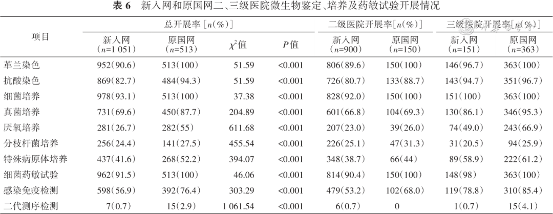 新入网和原国网医院在革兰染色、抗酸染色、细菌培养、细菌药敏实验项目的开展率均在80%以上,而分枝杆菌培养和二代测序的开展率均不高。同等规模的原国网医院各项目的开展率均高于新入网医院,尤其是厌氧培养项目(χ2=611.7,P<0.001)( 表 6 )。