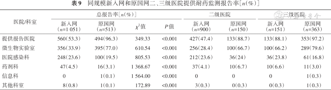 新入网和原国网医院分别有560(53.3%)和494(96.3%)的实验室可定期为医院提供耐药监测报告,微生物实验室和院感科为耐药监测的主要科室( 表9 )。