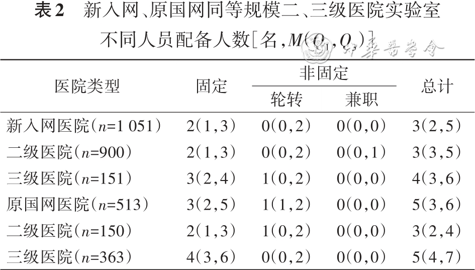 新入网二、三级医院微生物实验室人员分别为3(3,5)人和4(3,6)人,原国网二、三级医院微生物实验室人员分别为3(2,4)人和5(4,7)人( 表2 )。