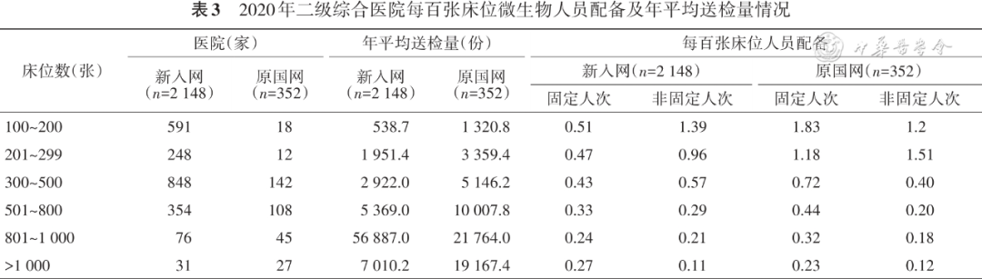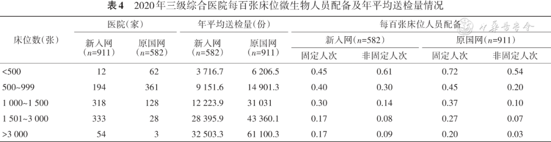 对4513家医院中的综合医院,进一步以编制床位数对1263家原国网和2730家新入网综合医院的微生物实验室年平均送检量(2020年)及微生物人员配备情况分层统计结果显示,在二、三级综合医院每百张床位微生物固定人员的配备上,除>1000张床位的二级综合医院,在其他同等规模床位水平,原国网医院均高于新入网医院。在细菌培养送检量上,三级综合医院每百张床位的平均年送检量均高于二级综合医院( 表3 、4 )。