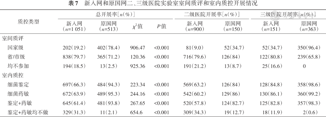 在室间质评方面,同等规模的新入网和原国网医院省/市级室间质评参评率均高于70%,而原国网医院国家级室间质评参评率(78.4%)远高于新入网医院(19.2%)。新入网二、三级医院中仍有191家(21.2%)和25家(16.6%)医院不参加任何室间质评项目。在细菌鉴定和药敏的室内质控方面,原国网医院的质控开展率(93.8%)高于新入网医院(61.4%),新入网二、三级医院中仍有309(34.3%)和18(11.9%)家医院未进行任何室内质控( 表7 )。