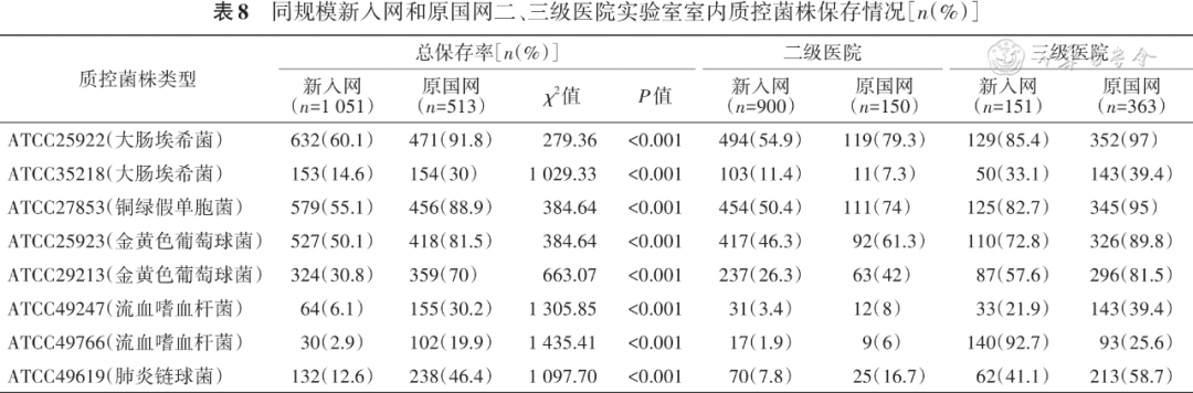 保存率以至少保存1种标准菌株计算,同等规模新入网和原国网医院分别有639(60.8%)和474(92.4%)家实验室保存室内质控的常见标准菌株。质控菌种保存率最高的是大肠埃希菌ATCC 25922(60.1%)、铜绿假单胞菌ATCC 27853(55.1%)和金黄色葡萄球菌ATCC 25923(50.1%)( 表8 )。