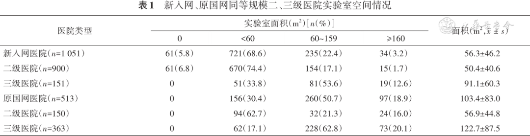 2021年新入网的同等规模二、三级医院中,共994家拥有独立微生物实验室,57家无独立微生物实验室。二、三级医院设有独立微生物实验室比例分别为93.7%(843/900)和100%(151/151),实验室面积分别为(50.4±40.6)和(91.1±60.3)m2。6.3%(57/900)的二级医院并未设独立微生物实验室,其中51.1%(29/57)的微生物实验室与检验科其他实验室共用空间,另49.9%(29/57)未设置微生物实验室。而513家原国网医院均已有独立微生物检测空间,二、三级医院面积分别为(56.9±44.8)和(122.7±87.5)m2( 表1 )。