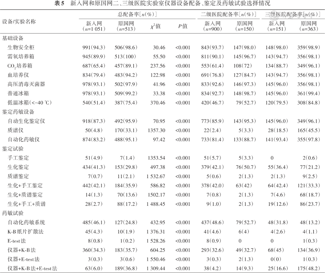方法 基于全国细菌耐药监测网(CARSS)中参与调查的4513家医院提供的微生物实验室建设及耐药监测能力数据信息,选取2021年新入网医院(3096家)和2021年前已加入CARSS的原国网医院(1417家)中同样规模床位数的1051家和513家,对其微生物实验室检测空间、仪器设备配置及检测方法、微生物检验、培养及药敏试验开展和质量控制等情况进行数据统计和分析。
