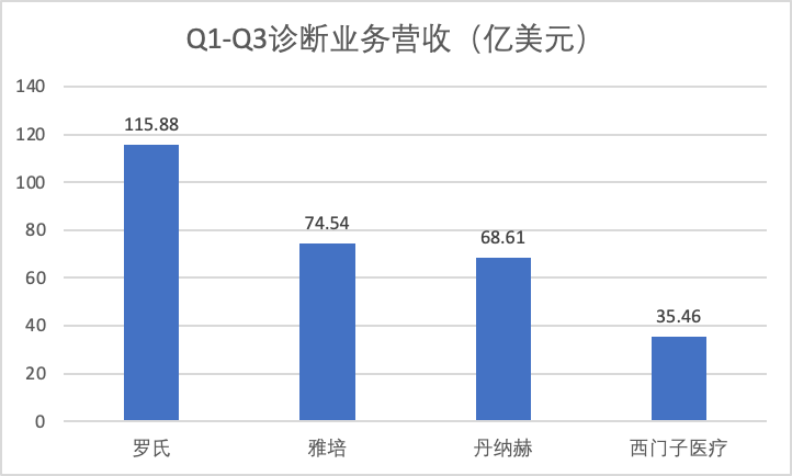 整体来看,罗氏诊断的龙头地位稳固;雅培与丹纳赫的差距缩小,后者若在并购上再度加码,有可能超越雅培;而第四名西门子医疗,除了未确定的分拆传闻外,还要面临后来者的步步紧逼,比如赛默飞世尔,2023前三季度其专业诊断业务营收33亿美元,与西门子医疗相比,仅差2.46亿美元,大有赶超之意。