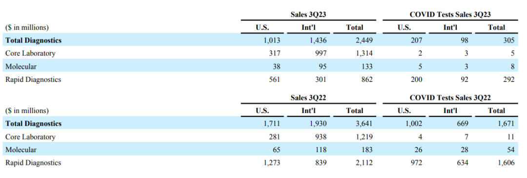 其中诊断业务营收24.49亿美元,是其第二大业务,占比24%。受新冠检测业务下滑影响,整体诊断业务同比-32.7%。其中COVID-19检测相关的收入从去年Q3的16.71亿美元降到3.05亿美元。