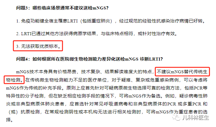 最近,有个检查项目开始明显变得多见起来,那就是二代测序(next-generation sequencing,简称“NGS”),又称高通量测序,检查单上往往是写“呼吸道多种病原体靶向检测”。 它的特点,是可以同时检测大量DNA片段,以相对较低的成本、较高的准确度、较快的速度,来帮助排查人体有无相应的病原体感染,其覆盖范围很广,一次性可以同时检测高达一百种病原体,可谓是神乎其技。 检查报告示例这种检查技术其实并不是今年才开始出现的,早在多年前我还在公立医院的时候,就已经有了,并且成熟应用于临床。只不过,那时候可能因为刚研发出来不久,所以检查费也比较贵,做一次往往要几千块,还得自费,一般仅仅是在住院部的一些特殊病人,尤其是做支气管镜的时候,才会考虑检查。 但科技的发展是日新月异的,现在NGS已经变得简单,甚至连咽拭子、鼻咽拭子等普通标本就可以做,而且相对也便宜了很多,价格从当年的几千,降到了七百多。 不得不说,NGS是一项具有划时代意义的检测技术,很大程度上解决了困扰临床已久的病原查溯问题,可以帮助医生快速找到致病病原体,从而及时采取针对性治疗。 但是,NGS带来便利的同时,也开始被滥用,尤其是最近,这个苗头变得愈加明显。我留意到,不管是社群、还是线上咨询,都有不少家长来咨询这个检查的相关问题,而且往往还都来自同一家机构。 事实上,这个检查,也有一些很大的局限性,它的优点,恰恰也正是它的缺点,因为它实在太灵敏了,所以常常会把正常定植在人体(尤其是口咽部)的细菌,也给检测出来,比如念珠菌属、链球菌属、葡萄球菌属、奈瑟菌属、厌氧菌等,而且也可能会被污染。 NGS的优劣所以,并不是查出来的所有病原体,都是导至生病的原因,尤其是咽拭子采样的话,假阳性的几率是很大的。这个检查结果,非常需要医生结合病人的病史、用药史、免疫状态等去综合分析,而不能直接作为诊断的唯一依据,否则很可能会导至过度诊断和过度治疗。 事实上,正因为它的这个局限性,所以有很多文献里都对它的检查适应证做了明确限制,比如2020年发布的《宏基因组测序在儿童呼吸道感染性疾病研究中的应用》就明确指出:其适应人群及适应证主要为:免疫抑制人群的呼吸道病原检测;重症肺部感染患者(在对结核、真菌、病毒等难培养病原的检测中表现出明显优势)。 再比如今年初最新发布的《下呼吸道感染宏基因组二代测序报告临床解读路径专家共识》也明确指出:无法获取优质标本时不建议做NGS,也不建议用NGS替代传统生物检测。 从以上这些资料我们不难看出:NGS这个检查,一般仅仅是用于免疫抑制人群、或重症肺炎患者,并不建议用于普通上呼吸道感染患者,尤其是在无法获取优质标本的时候。而咽拭子对于NGS来说就是一种劣质标本。 所以,把这个检查用在普通上呼吸道感染的孩子身上,通过咽拭子NGS去检查判断致病病原体,这在绝大多数时候,都是一种过度检查,也很容易引起过度诊断和过度治疗,同时还会引起家长的恐慌。 我最近在线上就接诊了不少这类案例,举两个例子,大家自己感受: 例子一: 5岁患儿,发热、咳嗽、流鼻涕3天,NGS查出来发现有肺炎链球菌、化脓链球菌等多种病原体,面诊医生考虑细菌感染,建议使用阿莫西林治疗。 但我仔细看了看病史,考虑还是病毒感染可能性更大,建议继续对症处理和观察。过了几天随访,孩子已经自愈了。 例子二: 4岁患儿,咳嗽、流涕9天,伴喘息,病初有发热,既往有喘息发作。NGS查出来是这个结果,有4种病原体,家长说看到结果人都傻了: 我给她详细解释了这个检查的局限性和结果真正的提示意义,建议先不着急使用抗生素,毕竟还是以呼吸合胞病毒感染的可能性更大,而不是所谓的同时4种病原体感染。她听完后才说放心了下来。 但以上仅仅只是两个代表性的例子,事实上最近遇到的类似案例还有很多。我想,对NGS没有了解的家长,花了七百多块钱,然后看到这样的检查结果,免不了都会心慌,而医生如果不结合病史去仔细分析,则可能会导至滥用抗生素的局面。 所以说,再好的技术,如果不规范使用,带来的只会是坏结果。规范诊疗,才能真正给孩子和家长带来好处。 医疗需要回归本源,医生也要不忘初心,共勉。 |