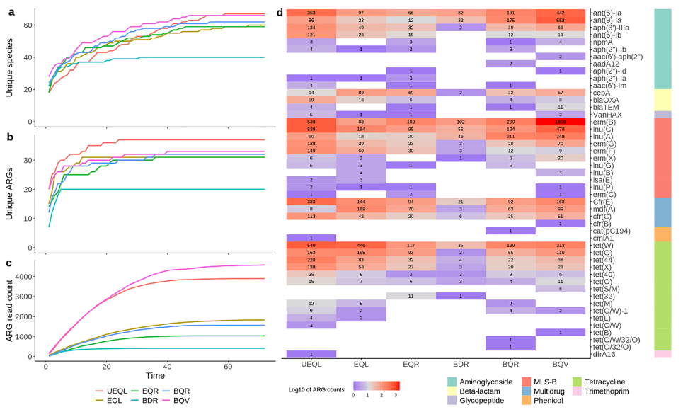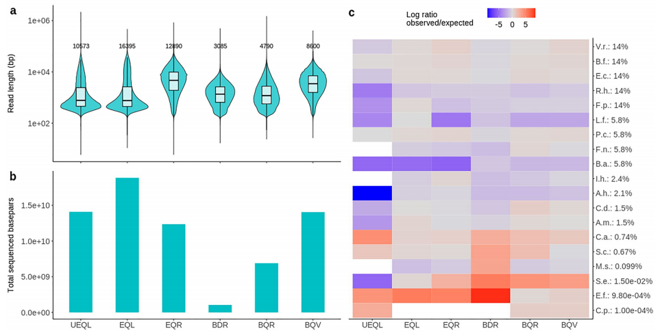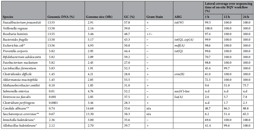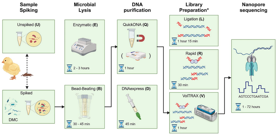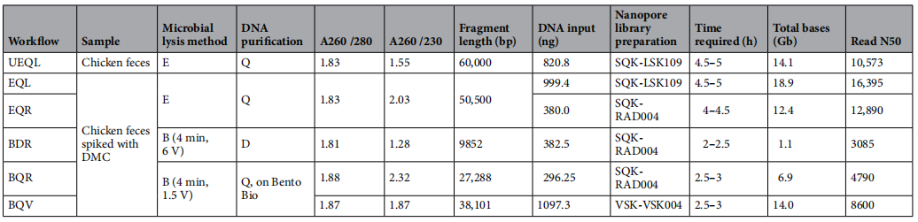 快速、准确和全面的诊断是确定疫情并改进病原体监测以防止进一步传播的关键。近年来,高通量下一代测序技术(NGS)创造了不需要培养或先验知识就能全面分析样品的可能性,这种方法被称为宏基因组测序(mNGS)。然而,目前的短读NGS技术需要专门的实验室、熟练的人员和高额投资,不能提供实时信息,只提供DNA片段信息,限制了随后的分类或功能分析。 最近,牛津纳米孔技术公司(ONT)开发的便携式、实时、长读测序技术为快速、全面的现场微生物诊断和监测铺平了道路。尽管纳米孔测序本身可以在小型设备上进行,但目前大多数DNA提取、文库制备和数据分析方法仍然需要非便携式设备和稳定的互联网和电网接入,这限制了潜在的使用。近年来,已经开发了几种设备和方法来实现现场宏基因组数据的生成。例子包括Bento Bio, SuperFastPrep-2和Claremont Bio OmnilyseX和DNAexpress试剂盒。此外,笔记本电脑供电的ONT VolTRAX允许在便携式设备上自动建库。 近日,一组来自比利时的研究团队在杂志Scientific reports上发表了一篇题为“Development of a portable on-site applicable metagenomic data generation workflow for enhanced pathogen and antimicrobial resistance surveillance”的文章。在本研究中,作者将重点放在湿实验室方面,结合Claremont Bio OmnilyseX, Bento Bio Pro和VolTRAX设备开发了一种便携式现场适用的mNGS方法。为了优化数据生成方法,作者使用鸡粪样本作为测试案例,因为家禽肠道微生物组已被证明含有多种抗生素耐药基因ARGs。作者逐步改进并最终建立了一个湿实验室流程,可产生高质量的纳米孔mNGS数据。并使用spike-in的模拟群落,作者将分类和抗性组分析性能与其他测序工作流程进行了比较。 图片来源:Scientific reports 主要内容 优化一种快速宏基因组DNA提取方法 为了减少设备需求和样品处理时间,选择Claremont Bio DNAexpress试剂盒来开发现场DNA提取工作流程。该方法包括在含有微珠和裂解缓冲液的电池驱动的Omnilyse X bead-beating管(B)中均质和裂解样品,然后是基于DNAexpress (D)柱的DNA纯化方案(如下图)。对方案进行了各种修改(缩写为BD)。然而,BD产生的DNA纯度较低,260 nm/230 nm吸光度比(A260/230)约为0.80,且经各种尝试后无法解决。因此,作者开发了BQ方法,保留了电池供电的Omnilyse X bead-beating(B)步骤,但用Quick-DNA HMW磁珠(Q)试剂盒取代了DNA柱纯化过程(如下图),发现这将A260/230比率提高到1.91,并将DNA产量提高了约500 ng。方案BQ的最终版本包括使用Omnilyse X管以1.5 V进行bead-beating,然后进行Q纯化和一轮AMPure XP纯化,bead/样品比为0.4(如下图)。它返回的高纯度DNA数量与目前基于实验室的EQ方法相当(酶(E)裂解然后是方法Q纯化)。 宏基因组工作流程概述。图片来源:Scientific reports 不同宏基因组工作流程的表现评估 使用加标模拟群落比较测序工作流程 为了评估各种宏基因组DNA提取方案的性能,将鸡粪样本加入由ZymoBIOMICS肠道微生物组标准(GMS)组成的DMC,并结合ZymoBIOMICS spike-in Control I,其中包含两种不存在于粪便背景中的海洋物种。此外,作者报告了通过ResFinder检测到的DMC参考基因组中的ARG含量,以及在添加DMC的鸡粪便样本中最终现场mNGS工作流程BQV产生的每个基因组随时间的横向覆盖率(测序reads覆盖的参考基因组比例)(如下图)。 模拟群落(DMC)的组成和特征,以及横向基因组覆盖率。图片来源:Scientific reports 流程对测序通量和读长的影响 为了比较现场DNA提取方案与其他工作流程的性能,作者生成了六个纳米孔测序文库(表3)。 UEQL:Unspiked-enzymatic lysis-quick-DNA magbead HMW-ligation sequencing; EQL:enzymatic lysis-quick-DNA magbead HMW-ligation sequencing, EQR:enzymatic lysis-quick-DNA magbead HMW-rapid sequencing, BDR:bead-beating-DNAexpress-rapid sequencing, BQR:bead-beating-quick-DNA HMW magbead-rapid sequencing, BQV:bead-beating-quick-DNA HMW magbead-voltrax sequencing. 作者比较了各种方案的测序输出和统计数据(如下表)。总的来说,酶解文库(UEQL, EQL和EQR)在测序通量方面优于bead-beading文库(BDR, BQR), 但BQV除外。酶解文库也表现出更高的读长N50。然而,bead-beading的执行速度要快1 - 2.5小时。与BDR相比,BQR和BQV中bead-beading强度的降低改善了DNA片段大小,从而获得更高的读取长度和通量。最后,BQV中较高的输入DNA量,以及VolTRAX文库制备中额外的自动磁珠清理,进一步增加了读取长度和通量,导至与基于实验室的文库EQR相当的通量,尽管读长N50仍然较低。 测序工作流程概述。图片来源:Scientific reports 测序工作流程影响分类学分类 作者将每种方法生成的reads与含有DMC参考基因组的数据库进行了比对,并将每个DMC物种的观测相对丰度(RA)与理论相对丰度(TRA)进行了比较(如下图)。简而言之,酶促法对几乎所有物种都产生了更长的reads,除了L. fermentum,并且在物种之间显示出较大的reads长度分布差异。相比之下,bead-beading方法通常导至较短读长,物种之间的读长分布差异较小。接下来,作者使用了一个广泛的分类数据库来进一步研究所有工作流程中检测到的粪便微生物背景。与未加标背景(UEQL)相比,一些背景物种,如Bifdobacterium gallinarum和乳酸杆菌科的成员在酶解工作流程中代表性不足(EQL, EQR)。对于bead-beading方法(BDR, BQR, BQV),情况并非如此。 每个工作流程的测序统计及DMC检测的比较。 图片来源:Scientific reports 现场工作流程使快速分类鉴定成为可能 给定一个已知大小和丰度的加标基因组,以及每个映射读数的测序时间,就可以确定