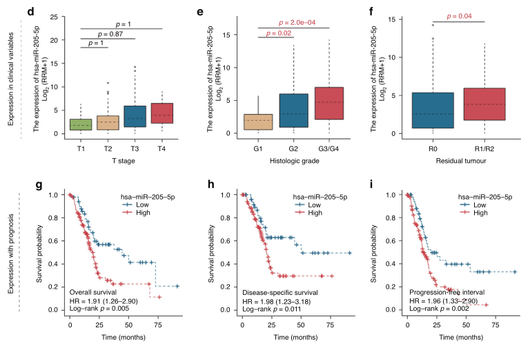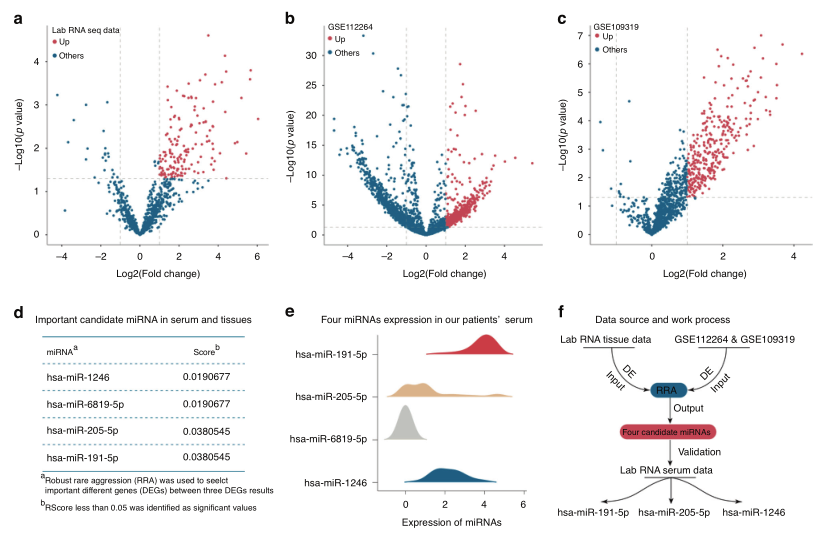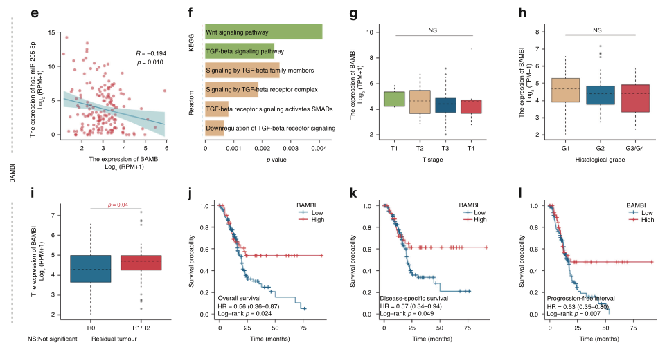 胰腺癌(PC)是一种高度侵袭性的癌症,在标准护理治疗下诊断后的5年生存率约为5-10%。PC的高死亡率主要是52%的PC病例被诊断为晚期,此时很少有患者能够接受治疗干预。因此,早期发现前列腺癌对改善整体预后起着至关重要的作用。 液体活检等微创方法为早期PC检测带来了希望。临床中广泛应用的胰腺肿瘤血清学标志物是CA19-9,但其在特异性、敏感性和对总生存期(OS)等结果的预测价值方面受到了挑战。其他血液生物标志物,如循环肿瘤细胞(CTCs)、外泌体、循环肿瘤DNA (ctDNA)或cfDNA,在其临床适用性和作为生物标志物的验证方面存在主要障碍。例如,ctDNA/cfDNA在PC中应用的主要挑战之一是外周DNA水平极低,这可能对早期疾病敏感性产生重大影响。ctDNA中的DNA甲基化分析需要更多资源,这限制了该技术在常规使用中的临床应用。相比之下,成熟的miRNA在体液中高度稳定,并在不同的癌症类型中表现出特殊的特异性,体液中肿瘤miRNA标志物的筛选在协助疾病的早期诊断和纵向监测治疗成功方面具有重要的临床价值。 近日,一组来自德国的研究团队在杂志British journal of cancer上发表了一篇题为“Integrating a microRNA signature as a liquid biopsy-based tool for the early diagnosis and prediction of potential therapeutic targets in pancreatic cancer”的文章。作者将机器学习算法与现实世界和公共数据库分析相结合,用于PC中循环miRNA的早期筛选。通过四种机器学习方法,使用最热门的候选标记物来评估预测胰腺癌的准确性。最后,作者探讨了临床预后价值,候选靶点,并预测可能涉及的调节细胞生物学机制。研究表明,此研究结果可能有助于进一步发展早期检测策略,通过使用微创筛查工具进行PC诊断和预后。 图片来源:British journal of cancer 主要内容 与邻近非肿瘤组织相比, 胰腺癌血清和组织样本中的miRNA上调 作者分别在实验室组织数据集(OLMS-T , 13 PC vs. 13 HT samples)以及GSE112264 (50 PC vs. 41 HT samples)和GSE109319 (24 PC vs. 21 HT samples)的血清数据集中分析了PC正常组织和肿瘤组织之间的miRNA表达情况。结果显示,OLMS-T数据集中PC组织中有66个差异化表达miRNA(DEM)上调,GSE112264和GSE109319数据集中PC血清中分别有418和267个DEM上调(图a-c)。作者选择RRA方法选择在肿瘤组织和血清中均表达升高的关键miRNA。作者选择了四种miRNA包括hsa-miR-6819-5p、hsa-miR-1246、hsa-miR-205-5p和hsa-miR-191-5p(图d)。实验室验证这四种miRNA在患者血清中的表达时,将hsa-miR-6819-5p排除 (图e)。 差异基因表达分析及特征miRNA鉴定。 图片来源:British journal of cancer 血清miRNA可准确预测胰腺癌的存在 在训练集中,随机森林(RF)算法显示三种miRNA(hsa-miR-1246, hsa-miR-205-5p和hsa-miR-191-5p)可以预测PC,准确率高达95.8%(图a)。CART、SVM和LR算法也显示出较高的预测精确度。曲线下面积分别为0.868、0.830、0.823(图b-d)。在测试数据集中,这三种miRNA也比传统的血清标志物显示出更好的预测PC的准确性。四种方法的预测模型准确率分别为94.4%、84.9%、82.3%和83.3%(图e-h)。在真实世界研究中,根据RF算法,该miRNA特征可以根据血清样本区分PC患者和健康患者,准确率为82.3%(图i);CART的准确率为83.5%,SVM的准确率为79.0%,LR的准确率为82.2%(图j-l)。 四种机器学习算法验证了microRNA panel的预测效果。 图片来源:British journal of cancer 血清miRNA特征区分胰腺癌和慢性胰腺炎 本研究共纳入了三个PC和慢性胰腺炎数据集,下图a显示了这些参与者的基线信息。在倾向评分匹配(PSM)之前,区分PC和胰腺炎的血清miRNA特征的预测准确率为84.5%(图b)。在PSM消除了3个数据集之间的基线差异之后,使用随机森林分析,此miRNA特征在患者血清中区分胰腺炎和PC的可预测性提高到91.5%的准确性(图d)。 三种血清miRNA panel可以区分胰腺炎和胰腺癌。 图片来源:British journal of cancer 血清hsa-miR-205-5p的高表达 与临床预后差和肿瘤切除不完全相关 分析hsa-miR-205-5p在TCGA-PAAD队列中的表达时,作者发现性别、年龄或种族之间没有显著差异,但在高T期或疾病组织学分级阶段较晚的患者中转录物丰度增加(图d, e)。R1/2切除组的血清hsa-miR-205-5p表达高于R0切除组(图f)。这些结果表明,hsa-miR-205-5p可以作为更晚期疾病的预测标志物。此外,在生存分析中,高表达hsa-miR-205-5p的患者在OS、DSS和PFI方面的预后总是比低表达hsa-miR-205-5p的患者差(p = 0.05, p = 0.011, p = 0.002)(图g-i)。 新型血清生物标志物hsa-miR-205与临床因素的关联。 图片来源:British journal of cancer 预测胰腺癌中hsa-miR-205-5p的上下游靶点 CLIP(交联免疫沉淀)数据共预测了hsa-miR-205-5p的1616个候选靶点,基因本体富集分析表明,这些靶点可在上皮细胞迁移、自噬和细胞-细胞粘附连接中富集(图a-c)。信号通路分析表明,上述靶点可能参与TGF-β信号通路以及系统发育保守的干细胞信号通路,如Wnt和Hedgehog信号通路(图d)。 为了确定可能的下游靶点,在对hsa-miR-205-5p与其在PC中的靶点进行相关性分析后,作者发现只有BMP激活素膜结合抑制因子(Activin Membrane-Bound Inhibitor, BAMBI)的表达与hsa-miR-205-5p的表达水平呈显著(负)相关。作者进一步探索BAMBI基因在PC中的潜在机制,途径富集结果表明该基因可能参与Wnt信号通路和TGF-β信号通路(图f)。考虑到hsa-miR-205-5p也在相同的通路中富集,作者推断hsa-miR-205-5p可能靶向BAMBI激活TGF-β通路,进而促进胰腺癌的发生。 预测hsa-miR-205及其候选靶点BAMBI的机制功能。 图片来源:British journal of cancer BAMBI mRNA高表