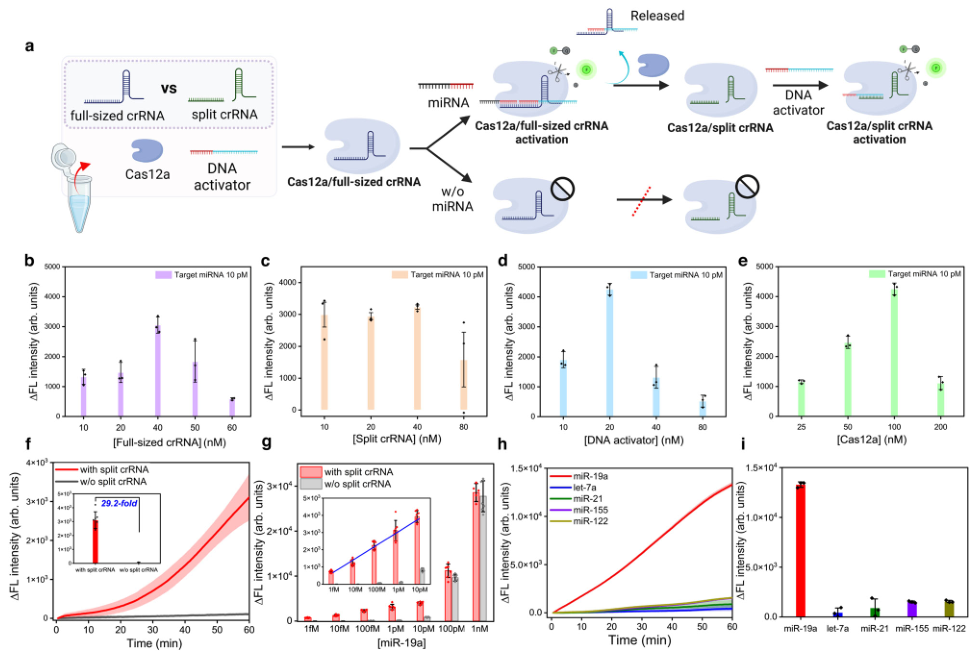 接下来,作者研究了是否可以通过非对称CRISPR检测进一步提高Cas12a的miRNA检测灵敏度,实现无扩增miRNA检测。作者设计了ssDNA 3 ' -activator,同时可以作为split crRNA靶标。还设计了一个split crRNA来识别部分DNA activator,以及一个同时结合miRNA和DNA activator的全长crRNA。结果显示,在不对称CRISPR实验中,在低浓度靶条件下,比如1 pM靶miRNA的终点荧光信号差异比无split crRNA时高29.2倍(下图f)。
