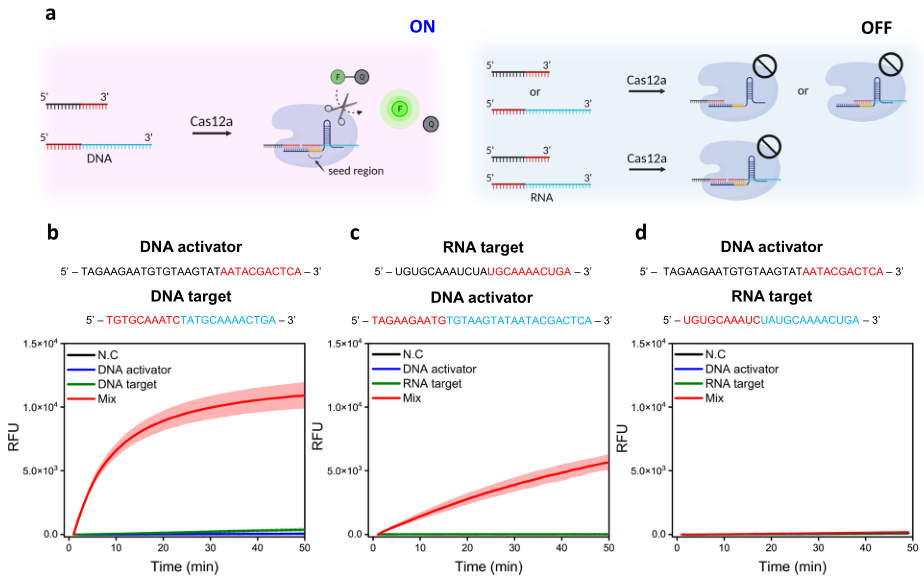 在不对称CRISPR实验中,当两种crRNA和split- T混合时,由于与split crRNA相比,全长crRNA对Cas12a的结合亲和力更强,因此形成Cas12a/全长crRNA复合物,抑制了split crRNA与Cas12a的结合,即使在split- T存在的情况下,CRISPR-Cas12a也不能被激活(下图b)。在靶核酸存在的情况下,Cas12a/全长crRNA复合物被特异性激活并启动第一次反式切割反应。随后,split crRNA取代全长的crRNA,并重新激活Cas12a进行第二次反式切割反应,从而导至额外的荧光信号扩增。因此,非对称CRISPR检测通过单个CRISPR- cas12a在单管中提供了简单、快速、高灵敏度的核酸检测。