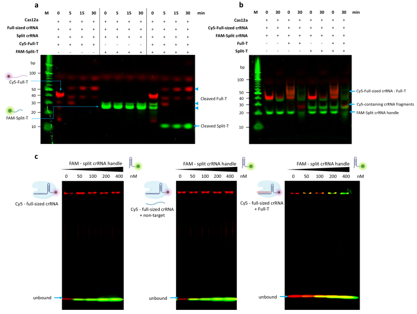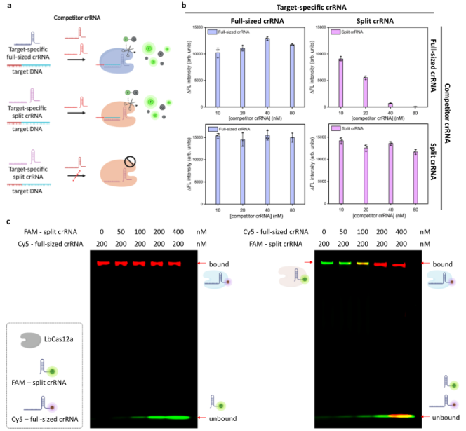 作者比较了靶向性split crRNA和全长crRNA在不同浓度竞争性全长crRNA下的反式切割活性。结果表明,随着竞争性全长crRNA浓度的增加,靶向性split crRNA的反式切割活性显著降低。相比之下,靶向性全长crRNA的反式切割反应不受显著影响。竞争性split crRNA对靶向性全长crRNA或靶向性split crRNA的反式切割反应均没有显著抑制(下图b)。这些结果表明全长crRNA比split crRNA对Cas12a具有更强的结合亲和力。电泳迁移试验结果也表明,全长crRNA由于具有更强的结合亲和力,可以调节split crRNA与Cas12a结合,并产生竞争性CRISPR反应(下图c)。