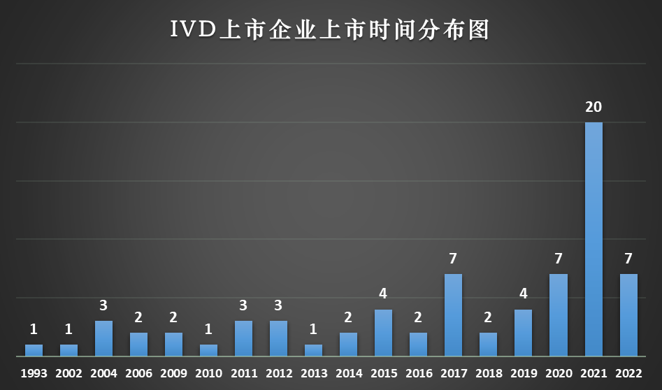 在《取真经 | 敢问IVD不卷,路在何方?》这篇文章中,小编曾概述了中国IVD的发展史,从1978年至今,中国体外诊断产业呈现出产业从无到有、从弱到强、从萌芽、初创到成长和高速发展的阶段。产业结构升级的过程,大致可以分为初创期(1978—1990年)、成长期(1991—2000年)、快速增长和竞争加剧期(2001年至今)三大阶段。我们来看一下与之相对应的上市企业的时间分布情况。