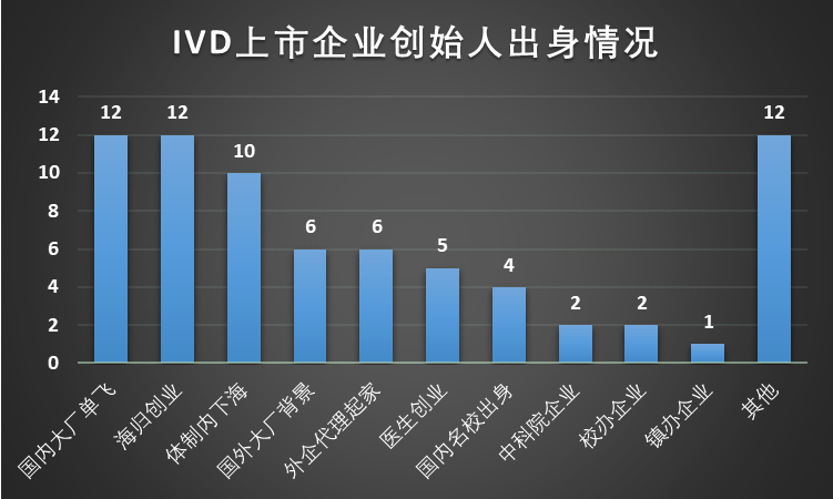 从上面的分布图可以发现,在中国IVD上市企业创始人中,国内大厂单飞、海归和体制内三种背景的加起来几乎占到所有情况的50%。虽然标签比较草率,但也能看出一些端倪,国内大厂单飞代表一种国内已经成功的商业模式的再尝试或者再突破,可谓青出于蓝而胜于蓝;海归则代表一种国外已经成功的商业模式或者新兴技术的引入,可谓它山之石可以攻玉;而体制内下海则代表一种资源的整合应用于另一个领域。