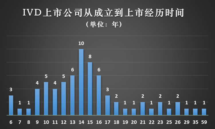 首先是成立时间,整体来看成立时间相对比较分散,1998-2005年是第一个相对集中的时间区域,平均每年有3家上市公司成立;2007-2008两年算是IVD上市公司的成立大年,平均每年有8家上市公司成立。