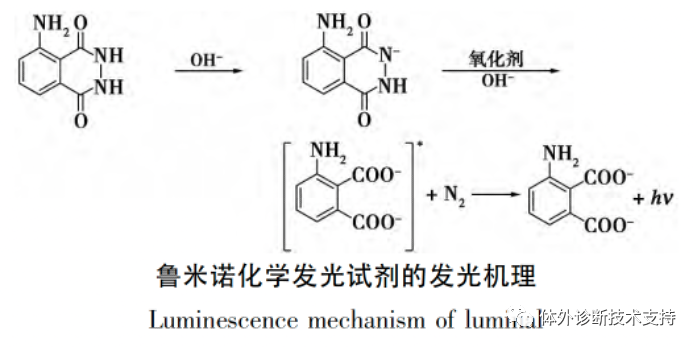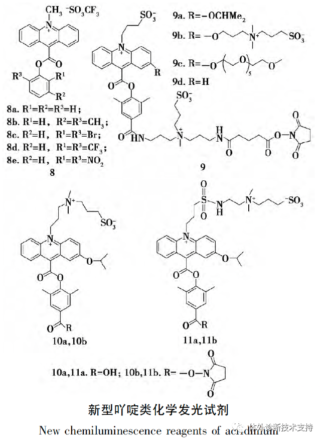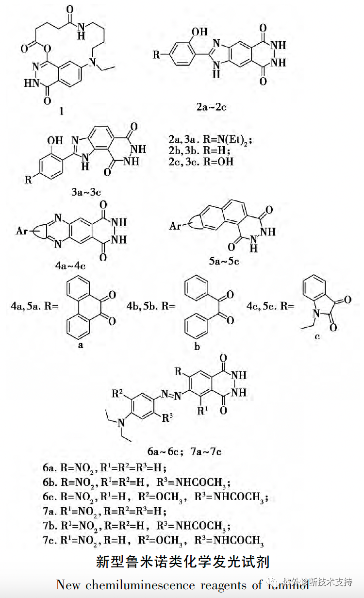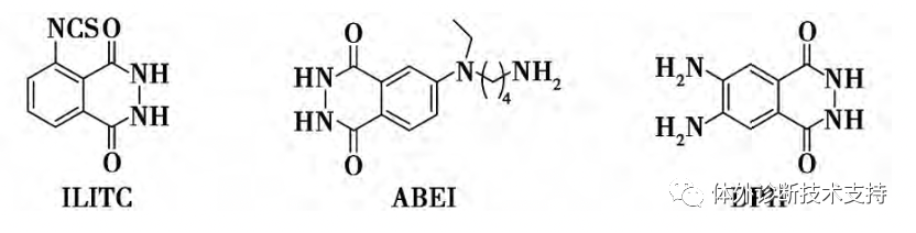 电化学发光免疫分析法(electrochemiluminescence immunoassay, ECLIA)是基于化学环境中光发射原理来检测和分析不同的蛋白质和生物分子,通过化学发光剂三联吡啶钌[Ru(byp)2+3]标记抗原或抗体,同时以三丙胺(tripropylamine, TPA)作为电子供体,经过电场中的电子传递作用,使其产生化学发光的检测方法。ECLIA 具有许多优点,与化学发光(chemiluminescence,CL)法相比,ECLIA 更具选择性,可以通过改变电极电位来选择性地控制激发态的产生;与光致发光(photoluminescence,PL)法相比,ECLIA 不需要光源,能有效降低光散射及发光杂质等问题;与电化学方法相比,ECLIA 具有较高的选择性和较少的电极结垢等优势[8]。而在临床检测中,由于电化学活性材料的干扰以及被吸附蛋白膜污染等因素,也会影响到检测结果。ECLIA 非常适用于小剂量样品的检测,不容易受样品中存在的溶血或浑浊沉淀物的干扰,易实现自动化。鲁米诺(Luminol)其结构简单、易于合成、性质稳定、无毒、环境友好、水溶性好,是应用最多的化学发光试剂之一。CAS号: 521-31-3 鲁米诺Luminol鲁米诺的化学发光性质最早于1928年被 Albrechi HO发现,他发现鲁米诺在碱性溶液中,加入过氧化氢可观测到微弱的发光现象,在此基础上加入适当的氧化剂和催化剂,可以大大提高其化学发光强度。过氧化氢酶、辣根过氧化酶、铁盐、锰盐、过渡金属离子、氨基配合物等均可以作为催化剂或氧化剂增强鲁米诺的化学发光,因此,根据化学发光检测分析的原理,由于上述物质影响了鲁米诺的化学发光速率,并进而影响其化学发光强度,使得鲁米诺可以用于上述物质的分析检测。鲁米诺、异鲁米诺(lsolumino1)及其衍生物是最早在CLIA 中使用的一种常用的化学发光物质。鲁米诺类物质的发光为氧化反应发光。在碱性溶液中, 鲁米诺可被许多氧化剂氧化而发光, 其中H2O2 最为常用。早期的鲁米诺体系主要用于无机物、有机生物小分子的测定, 但由于标记后发光强度降低而使其灵敏度受到影响。20 世纪80 年代, 人们发现发光体系中加入某些酚类及其衍生物、胺类及衍生物及苯基硼酸衍生物对该体系的发光有显著作用, 在这些称作增强剂的物质作用下, 鲁米诺的发光强度可被提高1000倍, 并且氧化剂与发光剂等单独作用时出现的“本底”发光显著降低, 发光时间也得到延长。这些增强剂的使用使得该体系在蛋白、核酸分析领域得到广泛的应用。鲁米诺的化学发光机理通常被认为已经被研究得比较透彻,但实际上,其被氧化中间产物还没有得到统一的结论,只是确定了其最终发光的物质为氨基邻苯二甲酸盐离子。鲁米诺的化学发光机理如图所示。常见的鲁米诺发光试剂包括有异鲁米诺异硫氰酸酯(ILITC)、N-( 4-氨基丁基) -N-乙基异鲁米诺(ABEI )以及4,5-二氨基邻苯二酰肼(DPH)等已经应用于很多领域。因为含有鲁米诺部分的发光试剂发光强度低而且合成困难,所以相关新型衍生物的报道不太多。而近几年该类新型衍生物发光试剂的研究趋势主要有两种:一种是在原有发光试剂的基础上进行相关的结构改造,以发现更优越的发光试剂。Palmioli 以ABEI 为基础进行结构改造,合成了一个呈大环内酯结构的新型异鲁米诺发光试剂ABEI 大环内酯(1) 。对比一般的等价试剂,发光试剂1具有更好的稳定性和反应性,而且合成路线简单高效。另一种是将不同的芳香环引入鲁米诺的氨基位置上,增加其化学发光强度进而获得新型鲁米诺衍生物。Deshmukh合成了含有羟苯基苯并咪唑部分的鲁米诺衍生物(系列化合物2、3) ,研究者另两篇文章又报道了含有苯并吡嗪或单偶氮单元的新型化合物(系列化合物4-7)。同时还研究了这些衍生物在过氧化氢、氰铁化钾及氢氧化钠溶液里面的化学发光特性,发现新型衍生物优于标准的鲁米诺和异鲁米诺体系。预测这些衍生物很有可能会是化学发光探针的候选者。4.2 吖啶酯类(actidinium ester)吖啶酯是一类重要的化学发光试剂,具有较高的量子产率,其化学发光效率较高,通常是鲁米诺的五倍或五倍以上。除此之外,吖啶酯的化学发光过程反应迅速,本底低,在氢氧化钠和过氧化氢的存在下即可发光。在氧化反应过程中,结合物被分解,不影响游离吖啶酯的发光;另外,吖啶酯类化学发光试剂具有较好的稳定性,易于储存。吖啶类是一种量子产率非常高的化学发光试剂,其分子结构至少由两部分组成: 发光基团(emitter) 和离去基团(leaving group) 。应用最广泛的是吖啶酯和吖啶磺酰胺,图中R、R'、R″为烷基、烷氧基及芳基等其他取代基; X、X'、X″为偶联基团,用于偶联抗原或抗体,并增加化合物溶解性取代基 R1、R2、R′、R′′的吸电子或供电子性以及它们的体积会影响过氧化氢阴离子HO2−亲核进攻吖啶酯9位羰基的能力,进一步影响吖啶酯的化学发光动力学,量子产率和其它方面的性质。取代基 R1的电性是化学发光动力学的决定性因素,例如离去基团上无取代基时(R1=H),化学发光过程持续约 1秒左右;由 2′5-二甲基,或 2′6 二甲基取代时,化学发光过程持续约 3 秒左右,被延缓;当离去基团上由 2′6 二溴取代时化学发光过程被加快,约 0.7 秒完成;当离去基团上有 2′6 二硝基或三氟甲基取代时,由于吸电子性更强,发光过程更快,约0.5 秒完成。取代基的位置还会影响吖啶酯的水解稳定性,2′6 位取代基由于引起位阻效应而使吖啶酯稳定性增强,可以预见体积较大的取代基引起较强的空间位阻