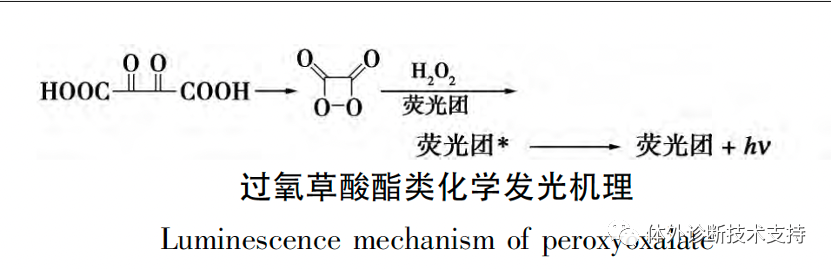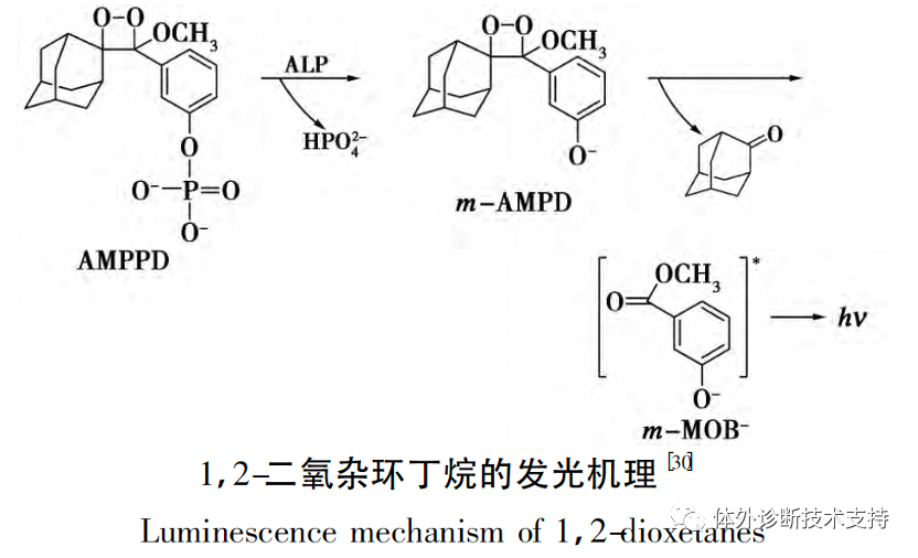 过氧草酸酯是以多氯水杨酸酯与草酰氯反应生成的草酸酯化合物,其化学发光机制可归结于化学致电子交换发光过程。此外,化学发光的基态产物是一类具有单重态或三重态的二氯乙烷分子。过氧草酸酯由于反应效率高及发光度强,现已被广泛应用于各种化学发光冷光源。过氧草酸酯类化学发光体系由草酸酯、氧化剂( 过氧化氢) 和荧光剂组成,是一种间接化学发光体系。常见的发光试剂有双[2,4,6-三氯苯基]草酸酯( TCPO) 、双[2,4-二硝基苯基]草酸酯( TNPO) 等。发光机理为反应生成的中间产物将化学能传递给荧光团使之激发到激发态,激发态的荧光团跃迁到基态过程中发射出一定波长的光。该发光体系的应用主要有两个方面: 一方面由于其发光量子产率高、寿命长、强度大、颜色可调等特点,适用于各种化学光源的研制; 另一方面,由于其灵敏度高、易于合成及所用仪器设备简单等优点,在化学发光分析中得到了广泛的应用。过氧草酸酯类常见的发光体系由TCPO、过氧化氢和不同的荧光剂组成。近几年,发现合成不同的新型荧光团( 对苯乙烯、苯并吡嗪衍生物、呋喃衍生物等) ,与TCPO 和过氧化氢组成发光体系成为发展趋势,并且广泛应用于不同领域,而新型的过氧草酸酯化合物研究比较少。1,2-二氧杂环丁烷类是一种化学引发电子变换发光(CIEEL) 试剂。它是四元杂环体系,而四元环存在张力能,因而在反应过程中能够释放出大量能量以满足化学发光反应所需的能量,所以是一类高效的发光试剂。其结构通式如下图所示,其中T 通常为环烷烃金刚烷,起稳定过氧环的作用; X 为烷氧基,作用是增加其水溶性; Y 是发光基团; Z 是Y 的保护基团。从1969 年Kopecky 和Mumford首次合成这类化合物以来,目前已经制备了100 多种二氧杂环丁烷类化合物。其中,具有代表性的是3-( 2'-螺旋金刚烷酮) -4-甲氧基-4( 3″-磷氧酰苯基) -1,2-二氧杂环丁烷( AMPPD) 。1,2-二氧杂环丁烷类的化学发光机理 ( 以AMPPD 为例) 为:AMPPD 在碱性磷酸酶( ALP) 的催化下,形成一个极不稳定的中间体m-AMPD; m-AMPD 迅速分解为一分子的金刚烷酮和一分子激发态间氧阴离子苯甲酸甲酯( m-MOB- ) ; 激发态的m-MOB-返回基态的过程中发射光子。