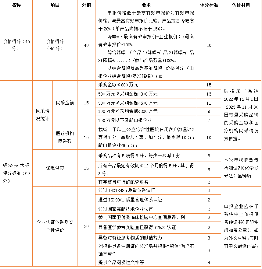 昨日,甘肃发布《甲状腺功能检测试剂集中带量采购公告(一)》,据公告,采购品种为甲状腺功能检测试剂(化学发光法),采购周期2年,全省所有公立医疗机构(含基层医疗机构卫生单位和军队医疗机构)作为采购主体。医疗机构要根据招采子系统中显示最小销售包装单位和对应人份数确认未来一年的意向需求量。本次公告中,意向采购量和最高有效申报价未告知具体数据,拟中选规则分为规则一和规则二,但是规则一的分数如何计算以及规则二具体细则暂未告知。11月30日,甘肃医保局曾发文公开征求《2023年甘肃省体外诊断试剂集中带量采购文件(征求意见稿)》意见。公告对比意见稿,内容用橙色字体表示。本次集中带量采购品种,是指按医疗器械管理的用于人体样本体外检测的甲状腺功能检测试剂(化学发光法),按检测项目的注册证名称包括有: