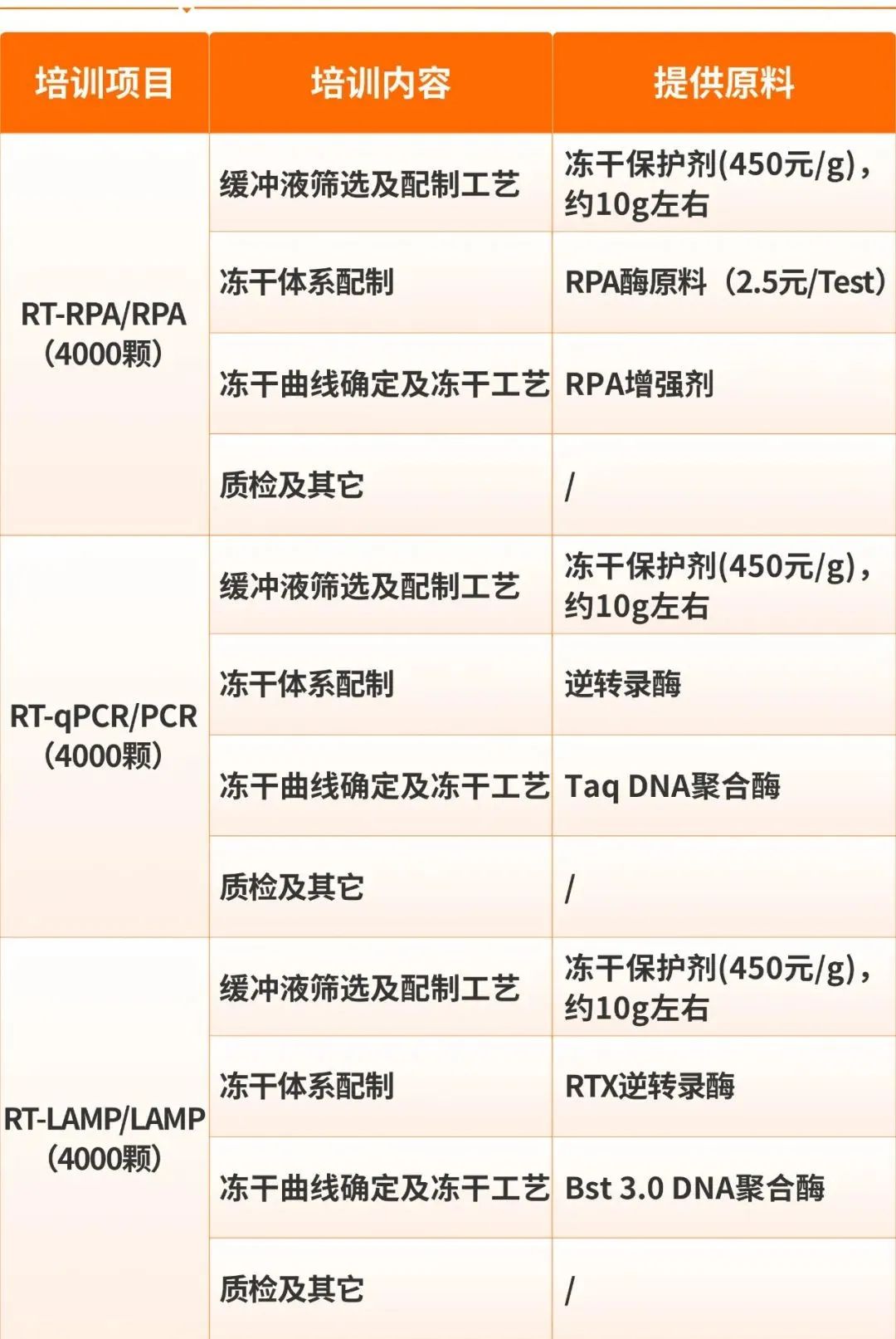 实操培训需准备: 参加实训需准备引物及探针(若无可以不准备),引物及探针需符合以下条件:酶、冻干辅料、实验耗材及实验设备均由可尔生命提供,现场冻干。售后承诺: 1. 如一次未掌握,可免费重复冻干实操培训一次; 2. 引物探针等核心物料需自行准备,食宿自理。