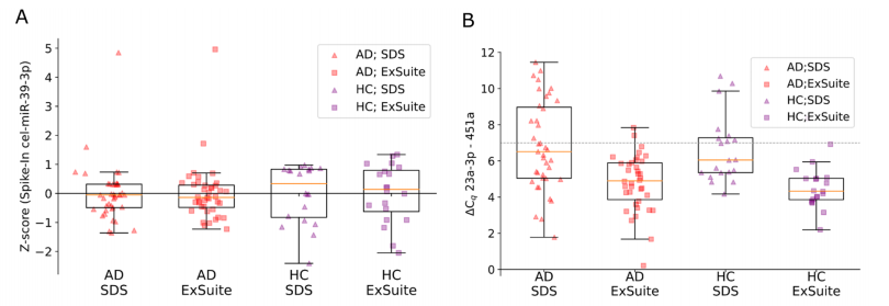 近日,一组来自波兰的研究团队在杂志Scientific reports上发表了一篇题为“Optimized RT‑qPCR and a novel normalization method for validating circulating miRNA biomarkers in ageing‑related diseases”的文章。文章中作者审视了使用RT-qPCR测定血浆miRNA的分析管道,并强调当前标准实践需要优化的领域,并提出建议。建议包括使用基于吸光度的算法检测样品溶血、使用双重外源对照来监测miRNA分离和逆转录步骤的效率,以及使用BestmiRNorm识别最佳归一化因子。作者使用BestmiRNorm验证了7种归一化因子,它们的组合在AD患者和健康对照中是稳定的。