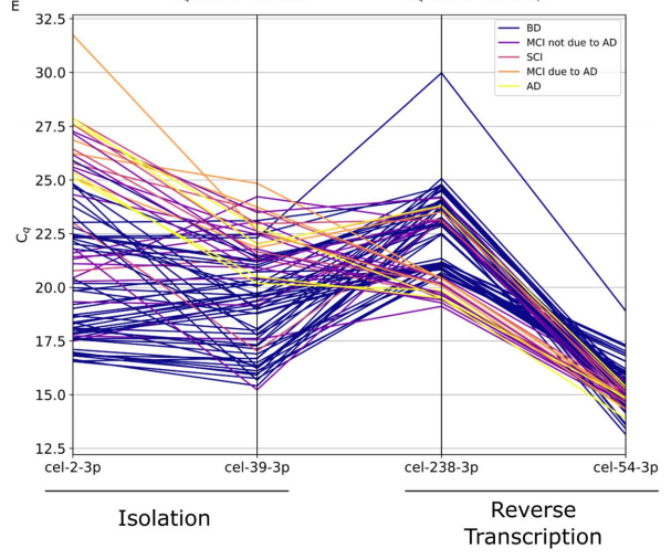 作者分析了140名受试者血浆样本中选定的miRNA水平,其中包括27名健康献血者和113名来自两个独立临床队列的受试者,包括非痴呆受试者、SCI受试者、早期和晚期AD患者(前驱AD即MCI-AD和AD)、MCI -非AD患者和其他形式痴呆(OD)患者。