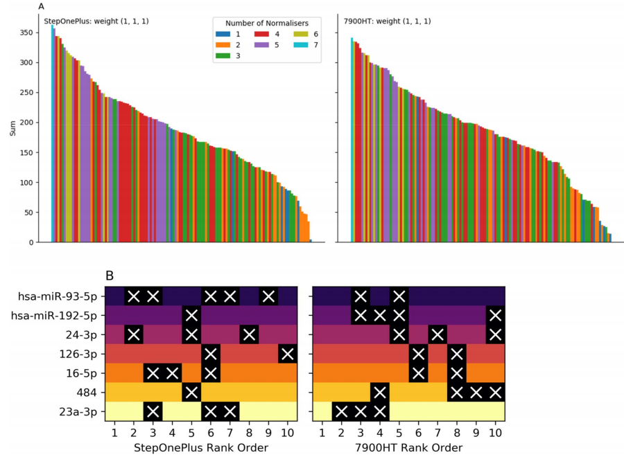 在对评分指标施加相同权重的情况下,下图A显示了所使用的两种不同qPCR仪的归一化内参排名分数比较。图B显示了在排名前10的组合中发现的特定归一化内参,其中miR-192-5p和miR-484存在于前10位组合中的9个中,表明它们特别稳定。对分数施加权重的结果表明,所有7个潜在归一化组合的平均值大致稳定。性能稳定的miR组合有117 (hsa-miR-192-5p, 126-3p, 16-5p, 484, 23a-3p)和84 (hsa-miR-192-5p, 24-3p, 126-3p, 484)。