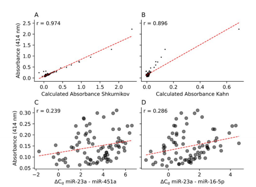 作者进一步探索了广泛使用的ΔCq方法用于评估溶血的效用,并与基于吸光度的方法进行了比较。结果显示ΔCq (miR-23a, miR-451a) 和ΔCq (miR-23a, miR-16-5p)(图C,D)与基于吸光度的方法相比显示出非常差的相关性。