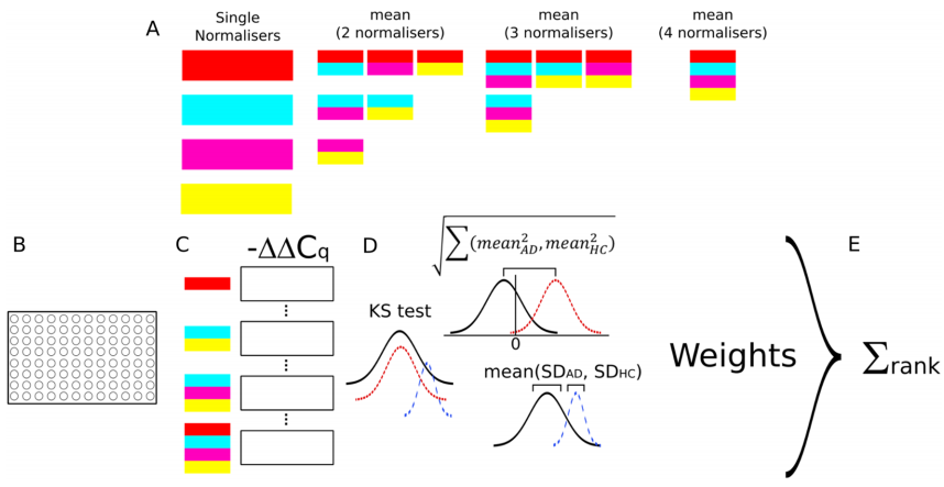 识别血液循环中的生物标志物,并使用低成本和微创的方法进行检测,有望成为改善许多疾病的诊断和预后的突破性创新。在过去十年测试的几种方法中,许多研究证实了循环microRNAs (miRNAs)对阿尔茨海默病和其他疾病作为生物标志物的能力。许多潜在的生物标志物候选物已经被提出,但这些研究缺乏一致性,主要是因为在miRNA分析,比如逆转录-定量聚合酶链反应(RT-qPCR)中缺乏方法进行归一化。当测量非细胞组织(如血液)中的DNA/RNA时,通常使用的内参(如GAPDH或β-肌动蛋白)在生理上不相关。使用内源性miRNA全局平均值作为内参进行归一化,在分析大量miRNA时是稳健的。然而,在较小规模的实验中,比如RT-qPCR,就必须另外选择最佳归一化内参。