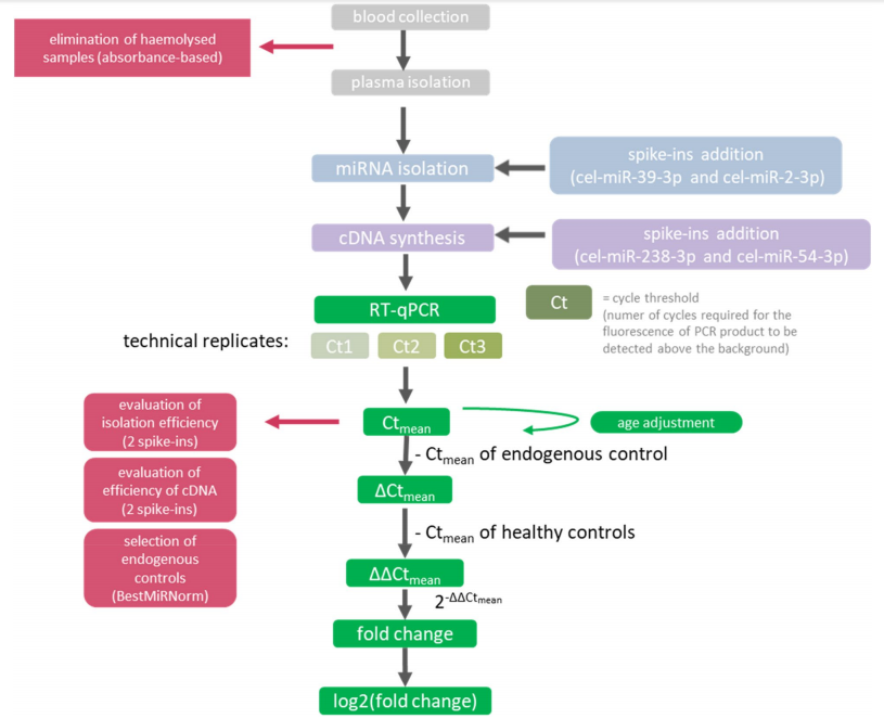 作者研究了分析循环miRNA的常见分析管道,并在可能引入可变性的关键步骤上提出了当前标准实践的优化。涉及以下qPCR步骤:分析前血液溶血样品的排除,添加外源miRNA作为miRNA分离和反转录的对照,以及归一化方法。下图总结了这篇文章推荐的标准化方法,以获得可靠的miRNA分析数据。