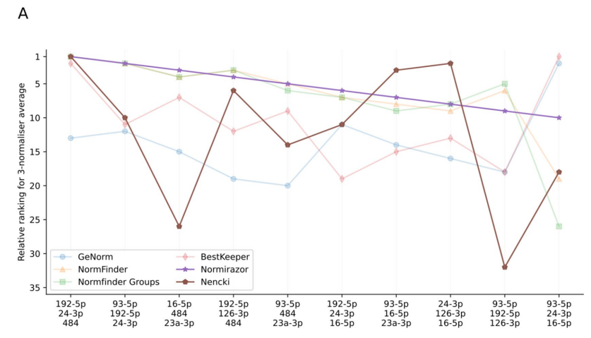 图A显示了使用最广泛使用的算法和新方法BestmiRNorm,比较三种归一化内参组合的排名。结果显示BestmiRNorm方法与Normirazor方法排名虽不同,但BestmiRNorm和Normirazor都发现了相同的3种归一化内参最佳组合(hsa-miR-192-5p, 24-3p, 484)。