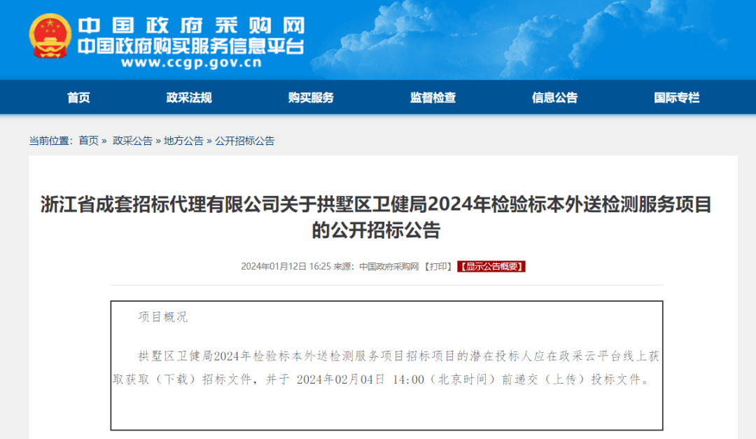拱墅区卫健局2024年检验标本外送检测服务项目招标项目的潜在投标人应在政采云平台线上获取获取(下载)招标文件,并于 2024年02月04日 14:00(北京时间)前递交(上传)投标文件。