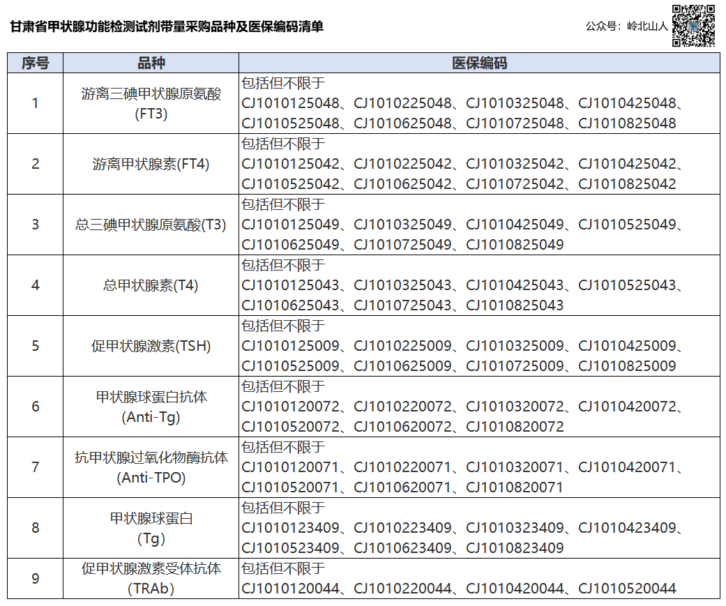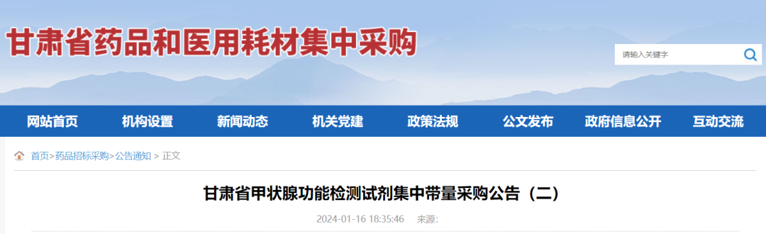 1月16日,甘肃省医保局发布《甘肃省甲状腺功能检测试剂集中带量采购文件(GS-IVDDLCG2024-1)》,欢迎符合申报要求的企业参与。