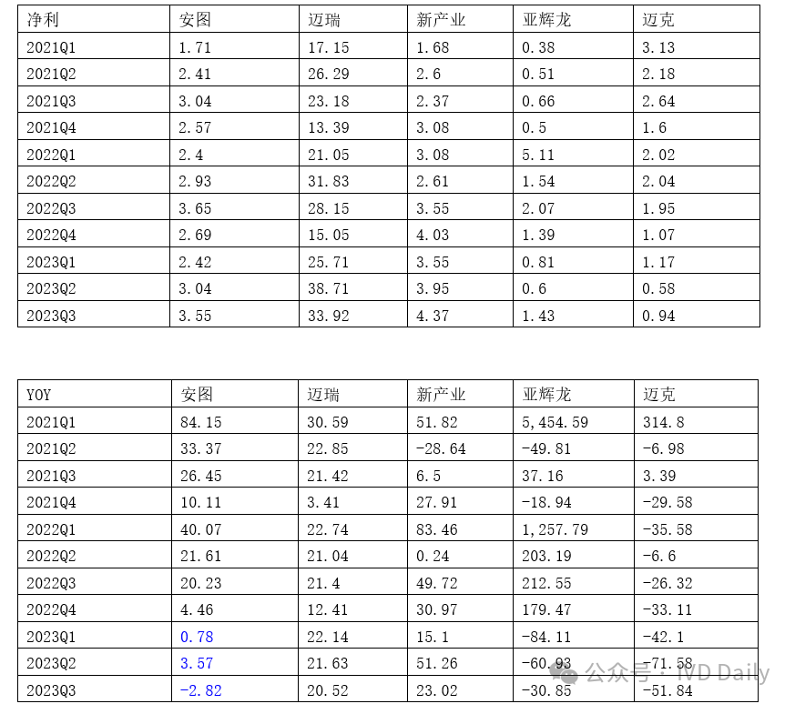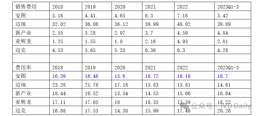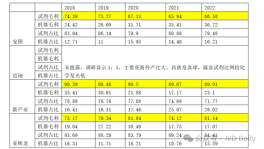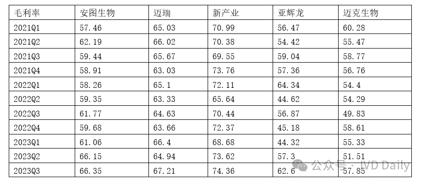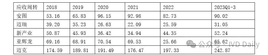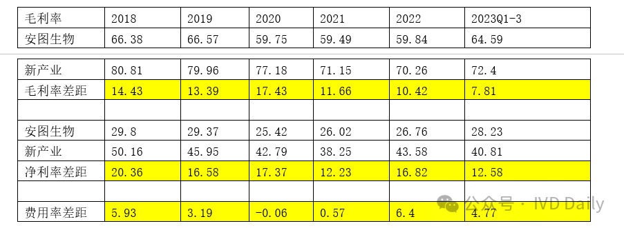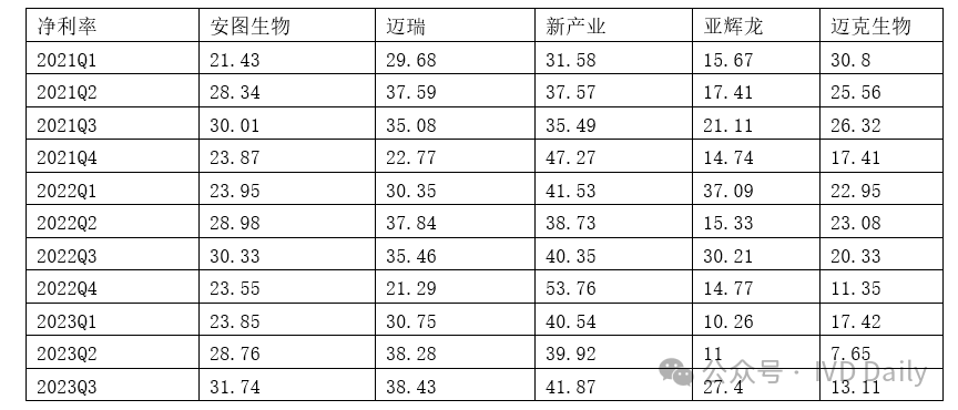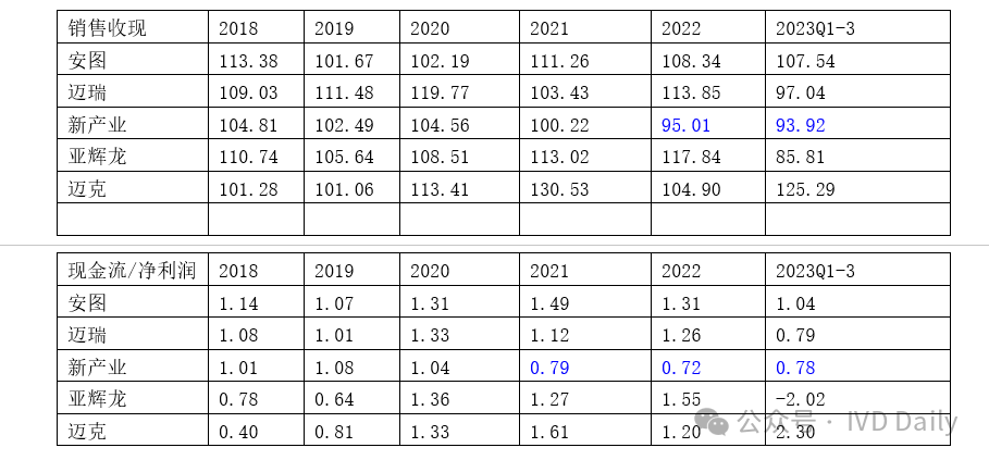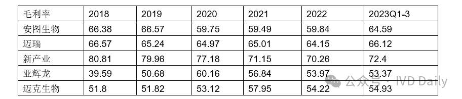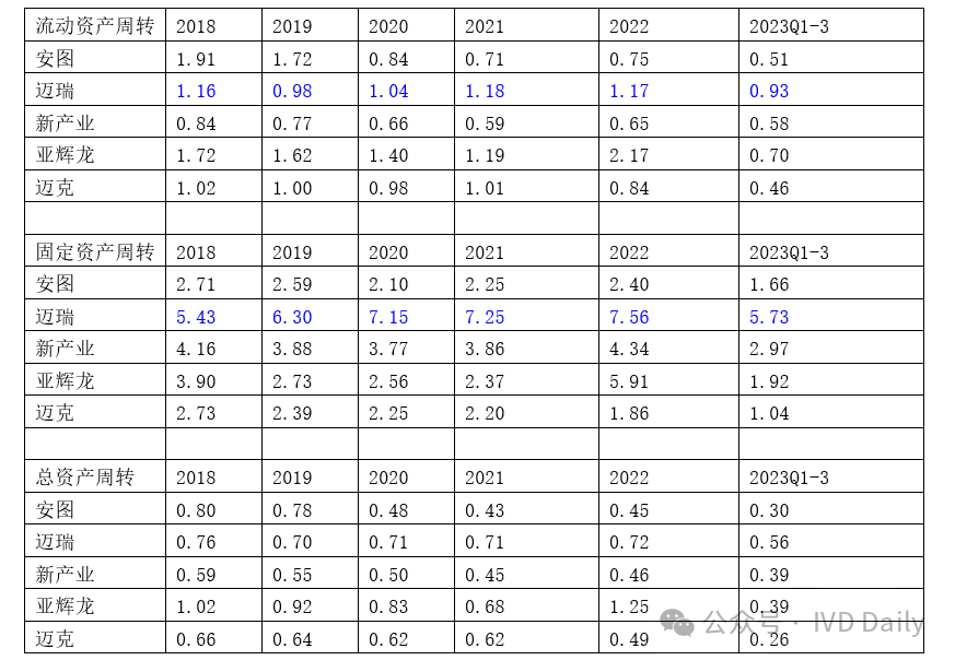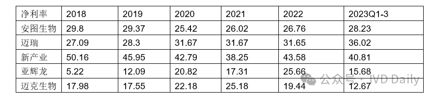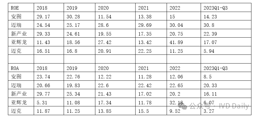 公司经营状况分析 1.盈利能力 1)毛利率对比情况 (1)行业毛利对比情况 新产业毛利最好,迈瑞次之,再分别是安图、亚辉龙,迈克。 (2)试剂机器毛利率拆解 新产业的毛利率试剂稳定在90,安图只有66,主要的原因在于,第一安图还有部分的生化试剂,这部分毛利低,拉低了毛利率。第二加上给经销商的折扣较大,导至毛利率较低。第三是产品的结构不同,导至加价率不同,整体新产业毛利拉安图较大。 (3)安图毛利按照产品结构拆解 新产业的毛利较安图高的原因是因为新产业的经销商的依赖程度低,采取的策略是国内经销模式为:通过公司自身的营销团队在各地目标医疗机构推广产品获取订单并提供售后服务,公司协助经销商进一步开拓市场及维护客户。(这种方式更加切合集采的新形势) (4)按照经销直销方式拆解 直销毛利较低,主要是部分代理产品走直销模式,拉低了毛利率。 (5)季度毛利变化的情况 可以看到安图生物的毛利率逐季向好,主要的原因是磁微粒产品的占比不断扩大,23年Q3已经达到45%,相比22年Q3提升了6个百分点。迈瑞保持稳定,新产业也有小幅提升。 2)净利率对比情况 (1)净利率对比情况 从净利率的情况来看,安图在第一梯队中是最差的,但是远远好于亚辉龙和迈克生物。对比安图与新产业,可拆分毛利影响与费用影响。 净利差距大的原因在于毛利影响与费用影响。安图的毛利率影响差距在较少,费用差距也逐渐的减少。 (2)净利率的季度情况 从季度的情况来看,安图在一季度四季度的净利都较差。新产业则没有明显的季节性且较好。 3)ROE\ROA情况 迈瑞表现最好,新产业次之。迈瑞的利润基本都拿来分红,维持性资本很低,安图账上理财30多亿,还有10多亿的现金,拉低了净资产收益率。 IVD是典型的高利润率、高周转的企业,和白酒的性质有点类似,是A股最好的商业模式之一。因为试剂的拿证周期长达5年,加临床的适应、推广、使用,技术护城河特别的宽。 4)营业外收支及投资收益 因为IVD的试剂有效期是1-3年,所以资产减值损失就是存货跌价损失,23年的存货跌价损失有5400万,一部分是新冠相关产品计提跌价损失。信用减值损失每年都有几千万,可以和迈瑞、新产业做一些对比。 可以看到安图的5年绝对值最大,说明在应收管理、回款管理、信用管理上和新产业、迈瑞还有一定的差距。 2.运营效率 1)应收账款周转对比 (1)应收账款占营收比例 应收账款管理最好的是迈瑞,其次是新产业、亚辉龙,安图,最差的是迈克。因为基本都采取经销模式,所以如何实现和经销商之间的良性互动,加快产品周转,提升应收账款效率,这是企业要重点考虑的问题。 (2)应收账款周转天数 从应收账款来看,迈瑞控制最好,说明他的营销政策切的细、吃的透、绑的紧的策略在行业最优,执行最好。新产业更多是自己营销人员进行定向爆破,获得订单后经销商再跟进。安图更多的是依靠大的经销商,这样应收的管理就比较难。 (3)应收账款账龄情况 虽然安图的1年以上的应收金额才1亿左右,但是对比同行业公司,还是处在较差水平。 2)库存周转对比 (1)库存周期天数对比 整体的库存周期都比较长,新产业因为机器投放的问题,该指标较差。迈瑞最好。 (2)具体库存明细对比 安图:原材料备货3.5亿,主要是活性材料、磁珠、酶和底液。发出产品没有,主要是没有铺借机器的机制,由经销商去铺机器。 新产业:铺出机器1.1亿,大约1000台左右,原材料备货3.4亿,和安图相当,说明对未来非常看好。没有计提存货跌价损失。 亚辉龙:原材料囤货2.9亿,发出商品1.6亿。机器铺的很多,原材料也很充足。 迈克生物:代理部分产品,库存商品6.4亿,较大。 3)应付账款周转对比 应付基本是2-3个月的账期。迈瑞整体最强,达到了70天。 4) 资产周转对比 安图的资产周转效率低于同行业。 5) 现金流情况对比 新产业的收现能力不如安图与迈瑞的原因主要是因为新产业铺了大量的机器出去,现金回收不如净利润、营收的增长速度。 3. 收入与费用 1) 收入对比情况 安图新冠2022年销售6.5亿,亚辉龙22年新冠27.5亿。扣除后安图23年还有15%的增长,亚辉龙有30%的增长。 2) 净利润对比情况 安图的净利已经被新产业超越,说明企业的增长因子,前期营收规划,都不如新产业和迈瑞。亚辉龙和迈克虽然量级还和安图有差距,但是亚辉龙的增长速度还是相当快的。 3) 季度毛利和净利情况 (1) 季度营收的情况 从最近三年的季度数据来看,安图的增长已经有较大的颓势,增幅较小。主要是生化集采,新冠的扰动。新产业体现了良好的成长性。 (2) 季度净利的情况 安图的净利都是小个位数的增长,不如迈瑞和新产业。 4) 费用对比情况 (1) 管理费用对比 新产业的管理费用较低,22年出现异常主要是冲回前期计提的股权激励8000万。 (2) 销售费用对比 安图的销售费用率稳定在16个点,在行业处在中等水平。 销售人员费用占整个销售费用比重 人数:除了迈瑞、安图,国内营销的人数基本都是500多号人,说明覆盖全国的营销网络需要的人数基本都是固定的,但是产生的效果可能是不同的效果。迈瑞的人数接近3000人,是实现99%以上三级亿元覆盖的关键。安图的人员是第二多的,但是属于数量上领先,待遇上较差。 营销人员的薪酬:从安图的薪酬来看,营销人员的薪酬增长速度较快,但是平均薪酬只有新产业的1/3,远远不如新产业。亚辉龙是新冠的影响,导至薪酬