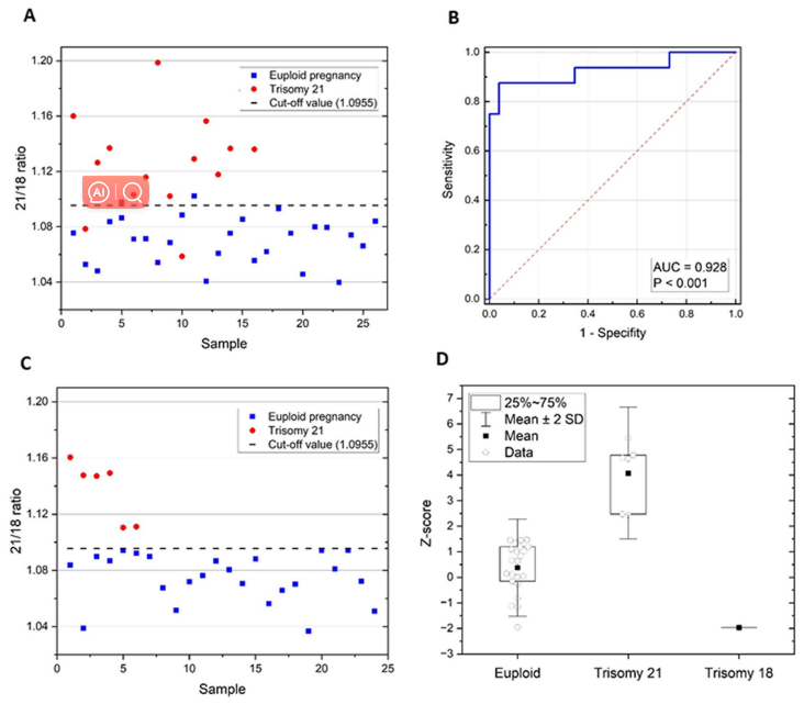 根据该阶段的结果建立受试者工作特征(ROC)曲线,确定整倍体妊娠和T21妊娠分类的比值Chr 21/Chr 18的cutoff值。为了获得最大的灵敏度和特异度,选择截止值1.0955。曲线下面积等于0.928,说明该检测方法具有很好的判别能力(图A、B)。使用这个cutoff值,16例T21妊娠中有14例被正确识别。特异性为96.2%,敏感性为87.5%。PPV为93.3%,NPV为92.6%。