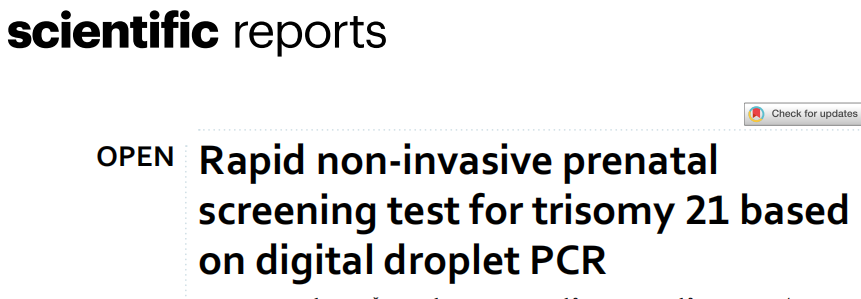 近日一组来自捷克的研究团队在杂志Scientific reports上发表了一篇题为“Rapid non‑invasive prenatal screening test for trisomy 21 based on digital droplet PCR”的文章。在这项研究中,作者采用多重液滴数字PCR检测21号染色体16个扩增子和18号染色体16个扩增子(作为参考)。两种荧光标记的锁核酸探针用于检测反应产物。分析了26例整倍体妊娠孕妇和16例21三体妊娠孕妇的血浆cfDNA,以确定样本分类的cutoff值。该测试在一项盲法研究中得到了验证,该研究对30名21三体风险为1:4至1:801的孕妇的血浆样本进行了检测。结果与侵入性诊断程序的结果完全一致(敏感性、特异性、PPV和NPV均为100%)。
